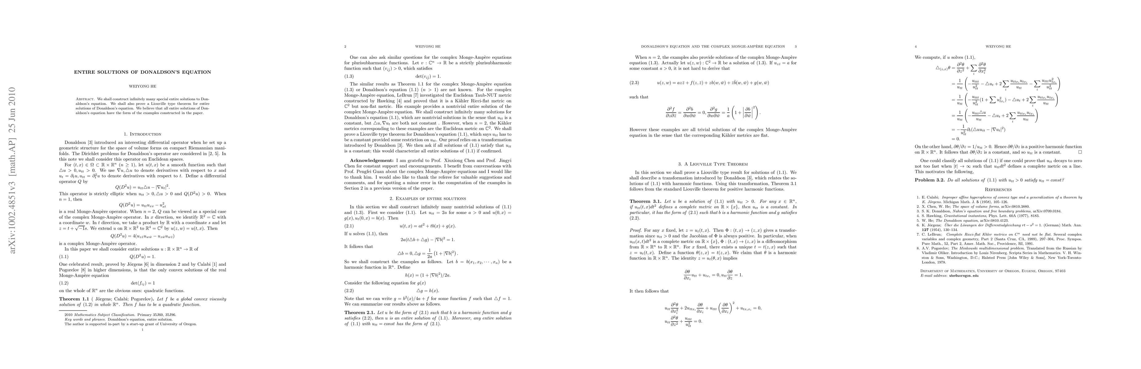 This paper constructs numerous nontrivial entire solutions to Donaldson's equation and proves a Liouville type theorem for such solutions, suggesting a potential classification of all entire solutions.