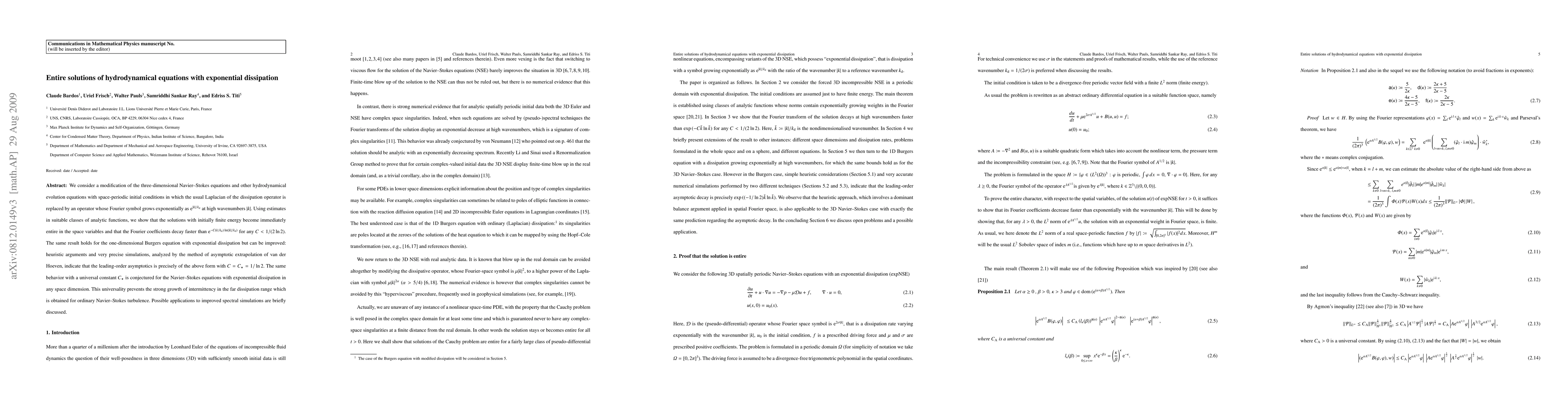 We consider a modification of the three-dimensional Navier--Stokes equations and other hydrodynamical evolution equations with space-periodic initial conditions in which the usual Laplacian of the dissipation operator is replaced by an operator whose Fourier symbol grows exponentially as $\ue ^{|k|/\kd}$ at high wavenumbers $|k|$. Using estimates in suitable classes of analytic functions, we show that the solutions with initially finite energy become immediately entire in the space variables and that the Fourier coefficients decay faster than $\ue ^{-C(k/\kd) \ln (|k|/\kd)}$ for any $C<1/(2\ln 2)$. The same result holds for the one-dimensional Burgers equation with exponential dissipation but can be improved: heuristic arguments and very precise simulations, analyzed by the method of asymptotic extrapolation of van der Hoeven, indicate that the leading-order asymptotics is precisely of the above form with $C= C_\star =1/\ln2$. The same behavior with a universal constant $C_\star$ is conjectured for the Navier--Stokes equations with exponential dissipation in any space dimension. This universality prevents the strong growth of intermittency in the far dissipation range which is obtained for ordinary Navier--Stokes turbulence. Possible applications to improved spectral simulations are briefly discussed.