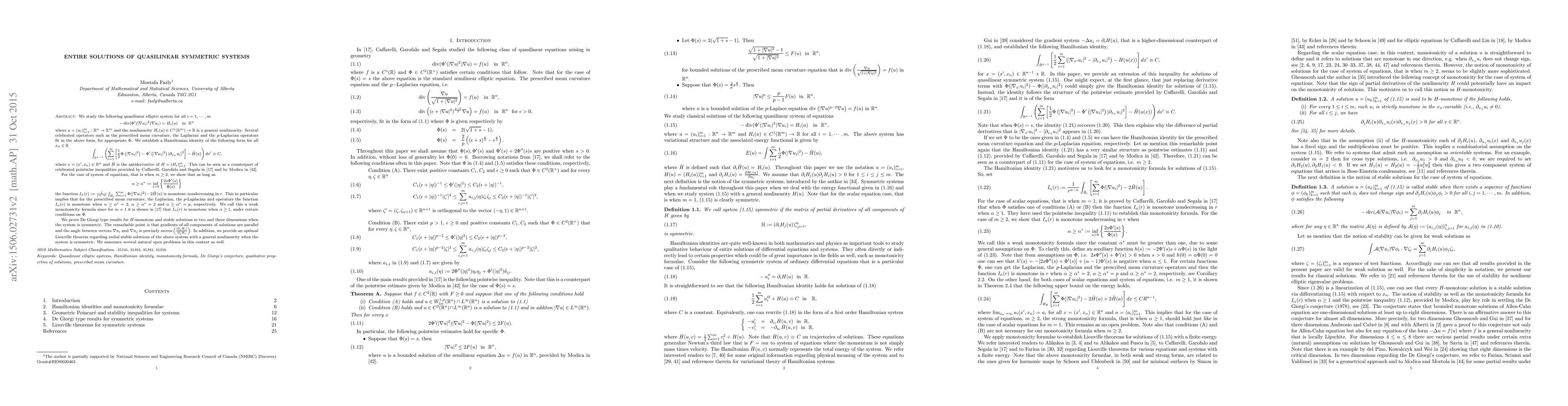 We study the following quasilinear elliptic system for all $i=1,\cdots,m$ \begin{equation*} \label{} -div(\Phi'(|\nabla u_i|^2) \nabla u_i) = H_i(u) \quad \text{in} \ \ \mathbb{R}^n \end{equation*} where $u=(u_i)_{i=1}^m: \mathbb R^n\to \mathbb R^m$ and the nonlinearity $ H_i(u) \in C^1(\mathbb R^m)\to \mathbb R$ is a general nonlinearity. Several celebrated operators such as the prescribed mean curvature, the Laplacian and the $p$-Laplacian operators fit in the above form, for appropriate $\Phi$. We establish a Hamiltonian identity of the following form for all $x_n\in\mathbb R$ \begin{equation*}\label{} \int_{\mathbb R^{n-1}} \left(\sum_{i=1}^{m} \left[ \frac{1}{2} \Phi\left(|\nabla u_i|^2\right) - \Phi'\left(|\nabla u_i|^2\right) |\partial_{x_n} u_i|^2 \right] - \tilde H(u) \right) d x'\equiv C, \end{equation*} where $x=(x',x_n)\in\mathbb R^{n}$ and $\tilde H$ is the antiderivative of $H=(H_i)_{i=1}^m$. This can be seen as a counterpart of celebrated pointwise inequalities provided by Caffarelli, Garofalo and Segala in \cite{cgs} and by Modica in \cite{m}. For the case of system of equations, that is when $m\ge 2$, we show that as long as $$\alpha \ge \alpha^*:=\inf_{s>0}\left\{\frac{2 s \Phi'(s)}{\Phi(s)}\right\}$$ the function $I_\alpha(r):=\frac{1}{r^{n-\alpha}} \int_{B_r} \sum_{i=1}^{m} \Phi(|\nabla u_i|^2) - 2\tilde H(u)$ is monotone nondecreasing in $r$. We call this a weak monotonicity formula since for $m=1$ it is shown in \cite{cgs} that $I_\alpha(r)$ is monotone when $\alpha\ge 1$, under certain conditions on $\Phi$. We prove De Giorgi type results and Liouville theorems for $H$-monotone and stable solutions in two and three dimensions when the system is symmetric.