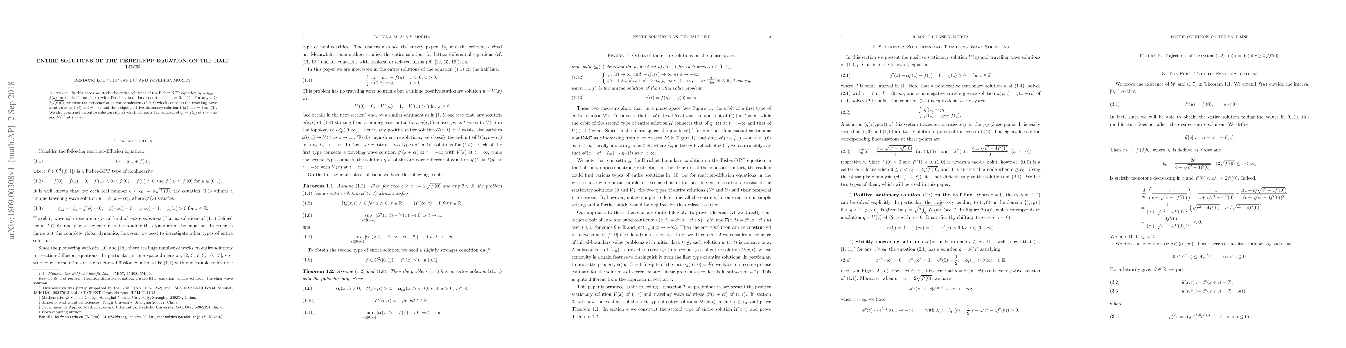 In this paper we study the entire solutions of the Fisher-KPP equation $u_t=u_{xx}+f(u)$ on the half line $[0,\infty)$ with Dirichlet boundary condition at $x=0$. (1). For any $c\geq 2\sqrt{f'(0)}$, we show the existence of an entire solution $\mathcal{U}^c(x,t)$ which connects the traveling wave solution $\phi^c(x+ct)$ at $t=-\infty$ and the unique positive stationary solution $V(x)$ at $t=+\infty$; (2). We also construct an entire solution $\mathcal{U}(x,t)$ which connects the solution of $\eta_t =f(\eta)$ at $t=-\infty$ and $V(x)$ at $t=+\infty$.
