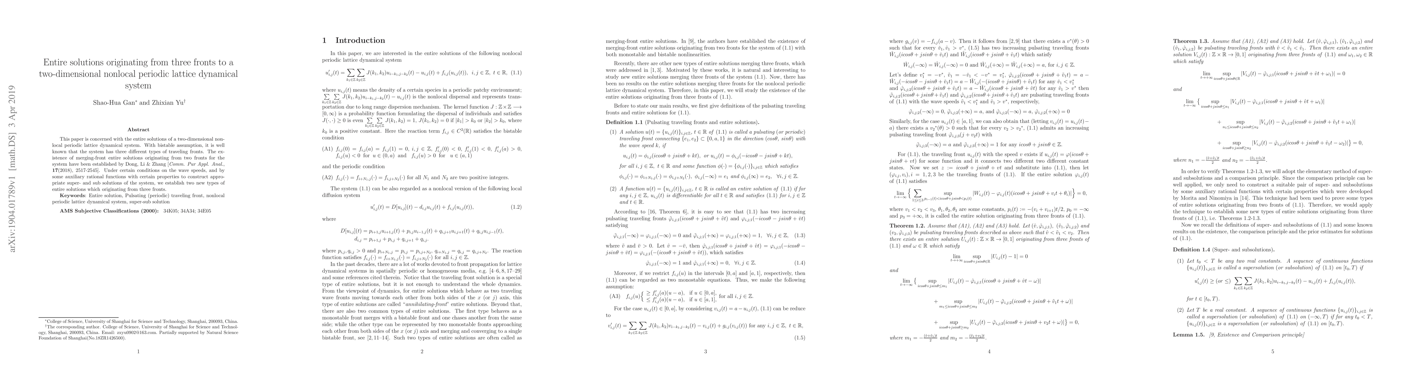 This paper investigates entire solutions for a two-dimensional nonlocal periodic lattice dynamical system, establishing new types of entire solutions originating from three fronts under specific wave speed conditions. These solutions extend previous findings on merging-front entire solutions originating from two fronts.