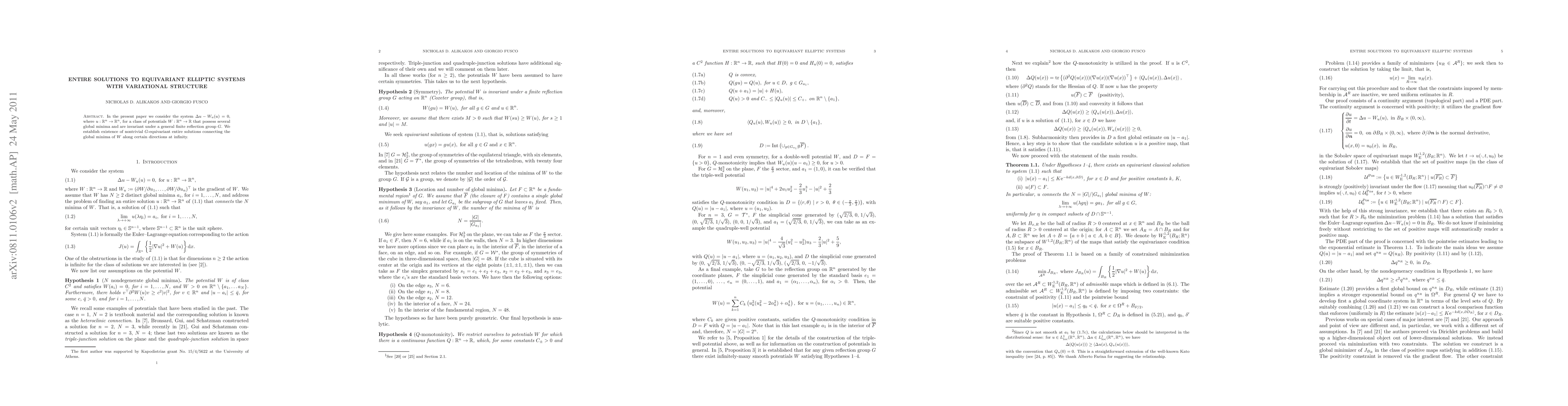 In the present paper we consider the system {\Delta}u - W_u (u) = 0, where u: R^n to R^n, for a class of potentials W: R^n to R that possess several global minima and are invariant under a general finite reflection group G. We establish existence of nontrivial entire solutions connecting the global minima of W along certain directions at infinity.