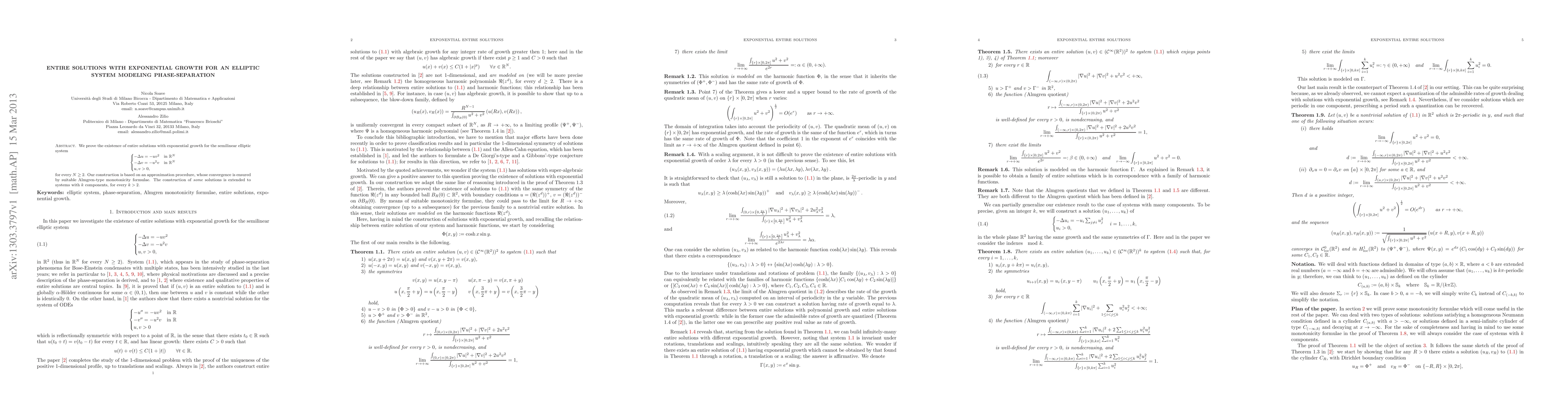 We prove the existence of entire solutions with exponential growth for the semilinear elliptic system [\begin{cases} -\Delta u = -u v^2 & \text{in $\R^N$} -\Delta v= -u^2 v & \text{in $\R^N$} u,v>0, \end{cases}] for every $N \ge 2$. Our construction is based on an approximation procedure, whose convergence is ensured by suitable Almgren-type monotonicity formulae. The construction of \emph{some} solutions is extended to systems with $k$ components, for every $k > 2$.