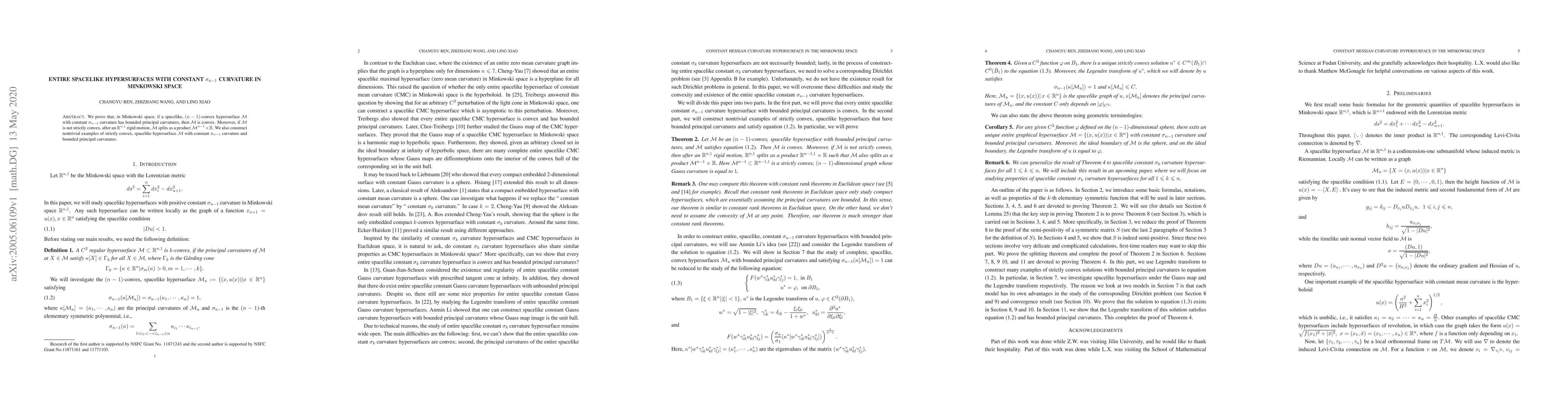 This research paper proves that in Minkowski space, spacelike hypersurfaces with constant $ u_{n-1}$ curvature and bounded principal curvatures are convex, and if not strictly convex, can be decomposed into a product of curves and lines after an $ ho^{n,1}$ motion.