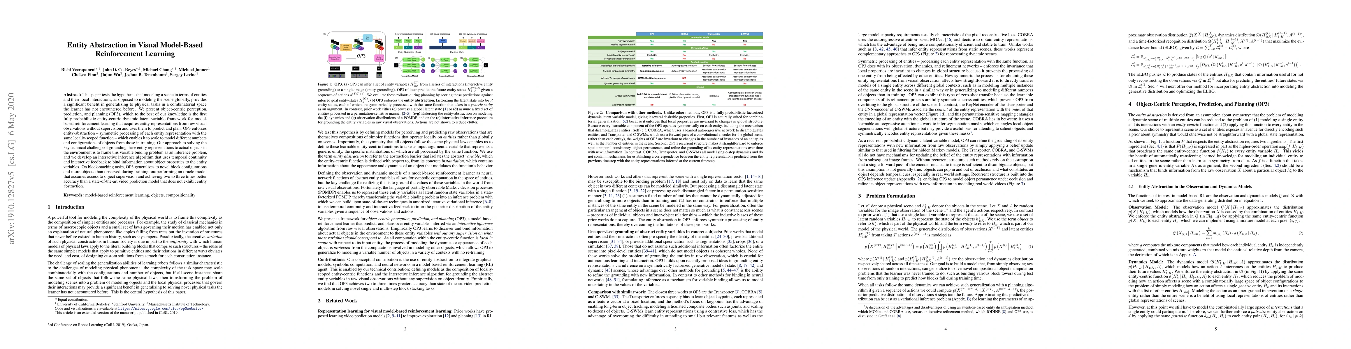 This paper tests the hypothesis that modeling a scene in terms of entities and their local interactions, as opposed to modeling the scene globally, provides a significant benefit in generalizing to physical tasks in a combinatorial space the learner has not encountered before. We present object-centric perception, prediction, and planning (OP3), which to the best of our knowledge is the first fully probabilistic entity-centric dynamic latent variable framework for model-based reinforcement learning that acquires entity representations from raw visual observations without supervision and uses them to predict and plan. OP3 enforces entity-abstraction -- symmetric processing of each entity representation with the same locally-scoped function -- which enables it to scale to model different numbers and configurations of objects from those in training. Our approach to solving the key technical challenge of grounding these entity representations to actual objects in the environment is to frame this variable binding problem as an inference problem, and we develop an interactive inference algorithm that uses temporal continuity and interactive feedback to bind information about object properties to the entity variables. On block-stacking tasks, OP3 generalizes to novel block configurations and more objects than observed during training, outperforming an oracle model that assumes access to object supervision and achieving two to three times better accuracy than a state-of-the-art video prediction model that does not exhibit entity abstraction.