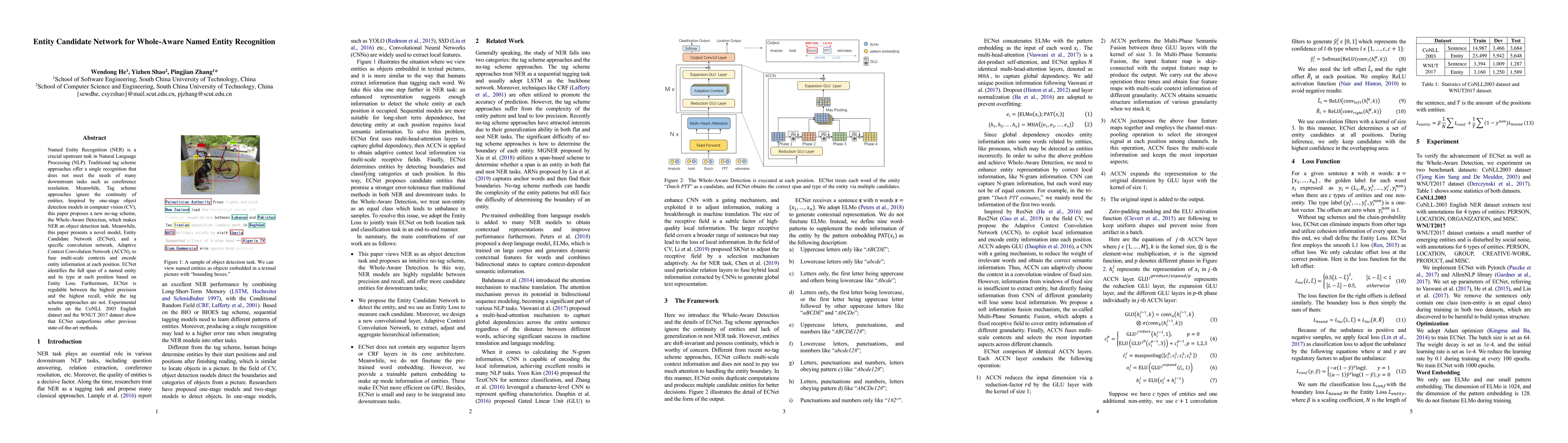 This paper introduces a novel Entity Candidate Network (ECNet) for whole-aware named entity recognition (NER), transforming NER into an object detection task. ECNet, combined with the Adaptive Context Convolution Network (ACCN), outperforms traditional tag-scheme methods by achieving higher precision and recall, and better handling entity continuity.