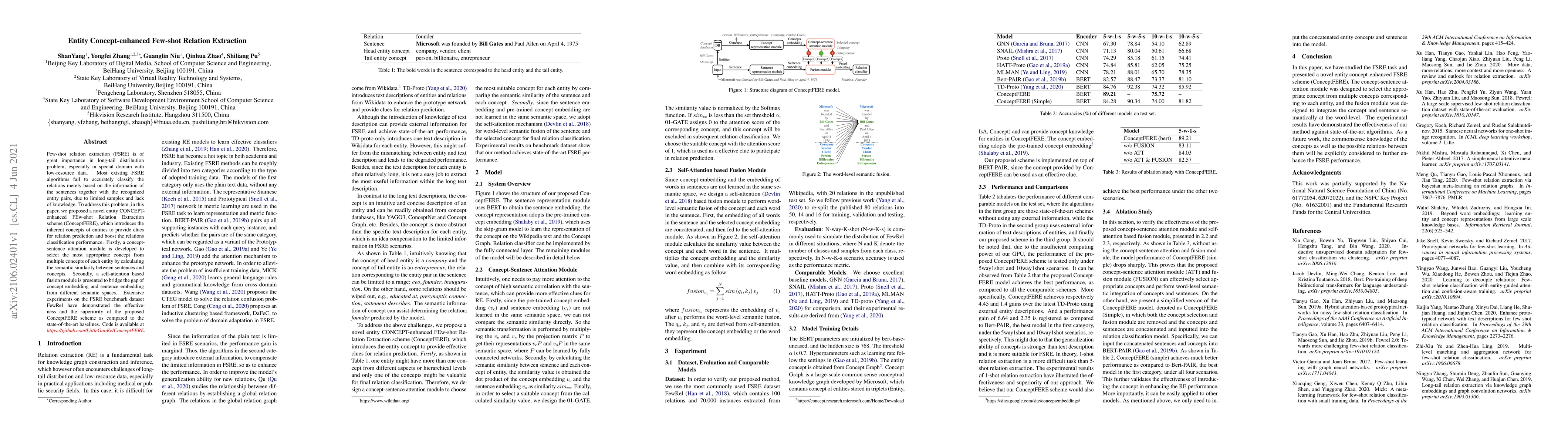 This paper proposes ConceptFERE, a novel scheme for few-shot relation extraction that enhances performance by incorporating entity concepts to improve relation classification. It employs a concept-sentence attention module and a self-attention fusion module to bridge concept and sentence embeddings, achieving superior results on the FewRel benchmark dataset.