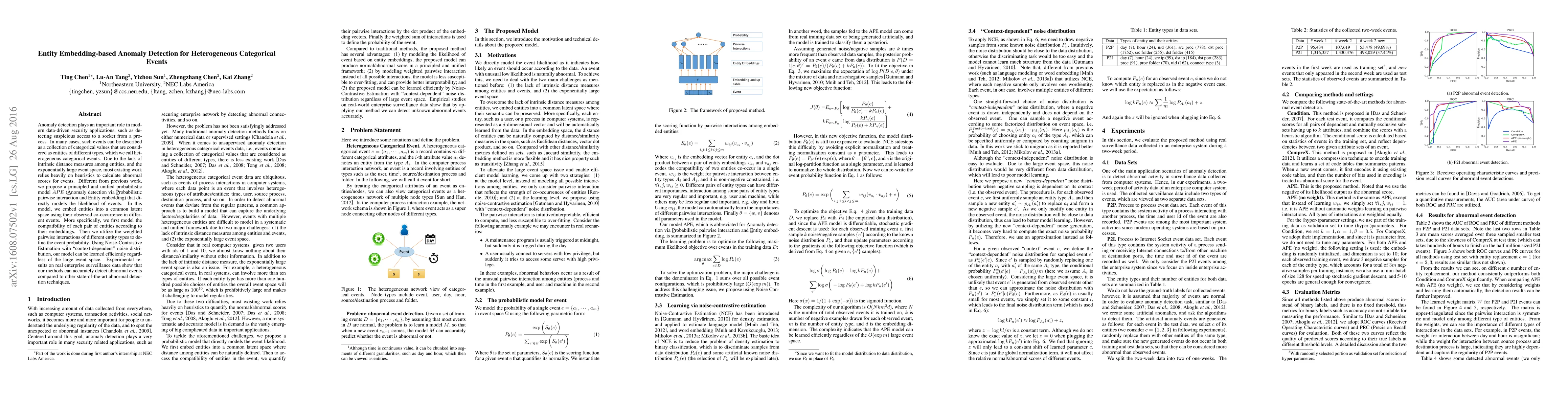 This paper proposes APE, a probabilistic model for anomaly detection in heterogeneous categorical events, embedding entities into a latent space to model their pairwise compatibility and interactions. Experimental results demonstrate its effectiveness over existing methods in detecting abnormal events in enterprise surveillance data.