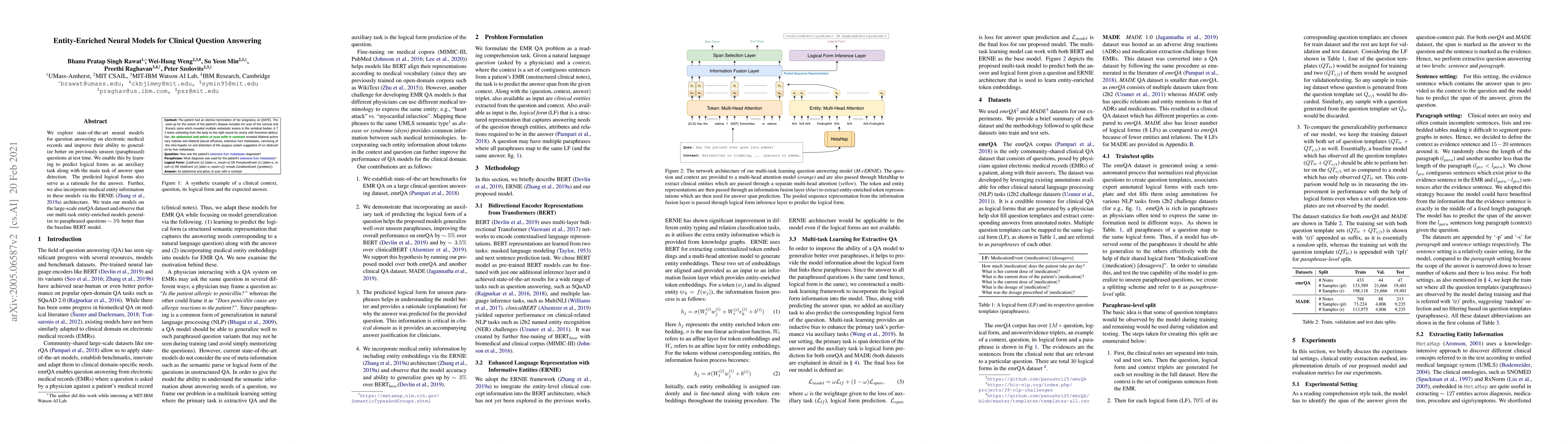 We explore state-of-the-art neural models for question answering on electronic medical records and improve their ability to generalize better on previously unseen (paraphrased) questions at test time. We enable this by learning to predict logical forms as an auxiliary task along with the main task of answer span detection. The predicted logical forms also serve as a rationale for the answer. Further, we also incorporate medical entity information in these models via the ERNIE architecture. We train our models on the large-scale emrQA dataset and observe that our multi-task entity-enriched models generalize to paraphrased questions ~5% better than the baseline BERT model.