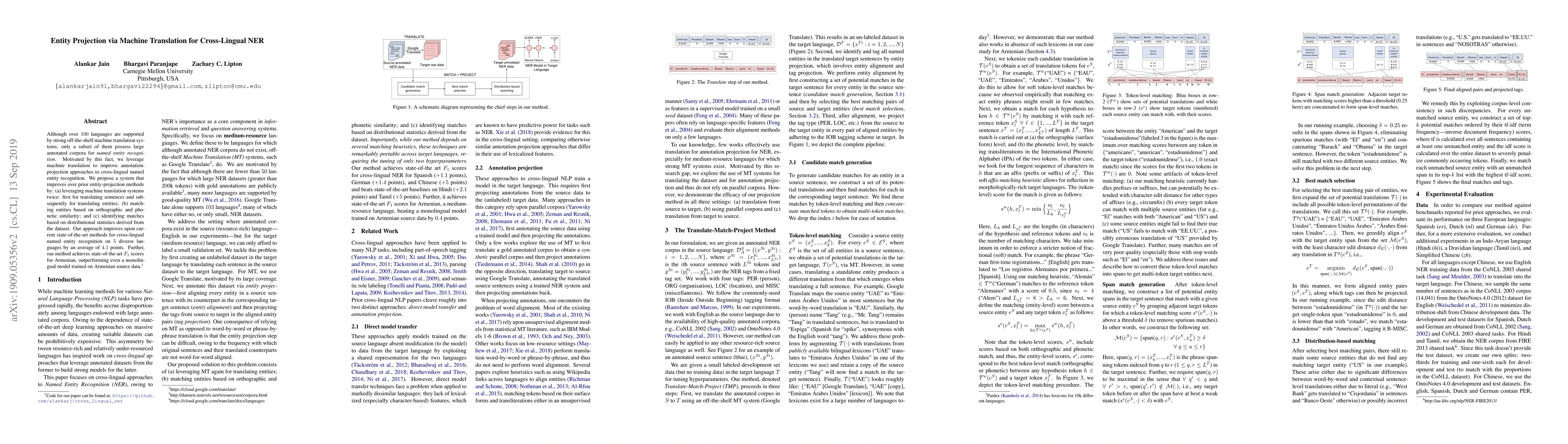 This paper proposes a method for cross-lingual named entity recognition (NER) using machine translation to project annotations from well-resourced languages to under-resourced ones. The system leverages translation for both sentences and entities, matches entities via orthographic and phonetic similarity, and uses distributional statistics for better identification, achieving state-of-the-art results on 5 languages.