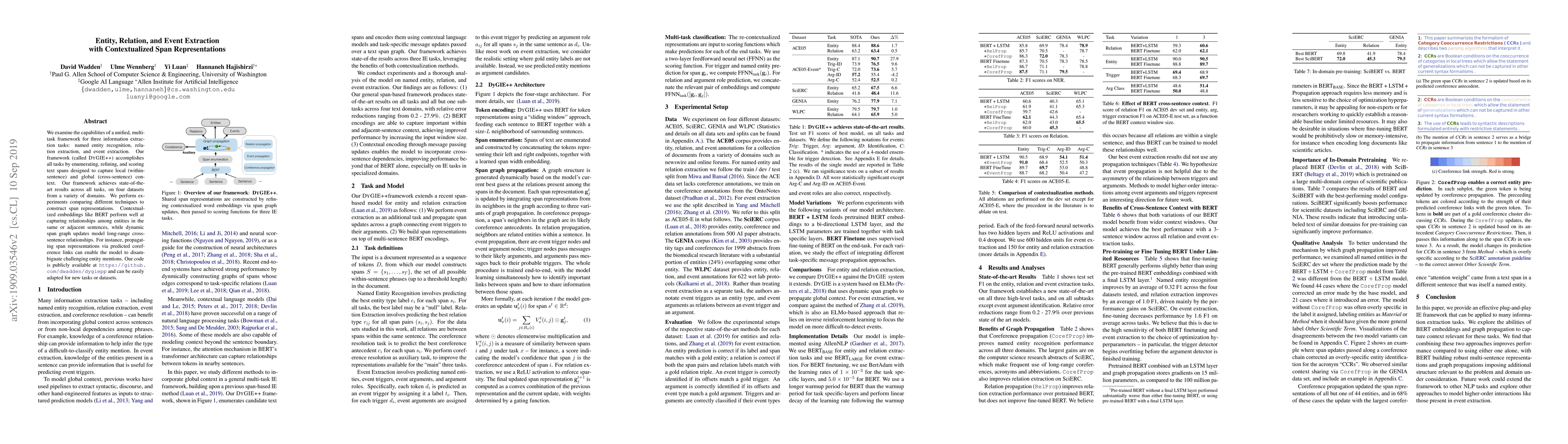 This paper presents DyGIE++, a multi-task framework achieving state-of-the-art results in named entity, relation, and event extraction, utilizing contextualized span representations and dynamic graph updates to model local and global context. The framework's success is demonstrated across diverse datasets, with BERT embeddings and coreference links enhancing performance.