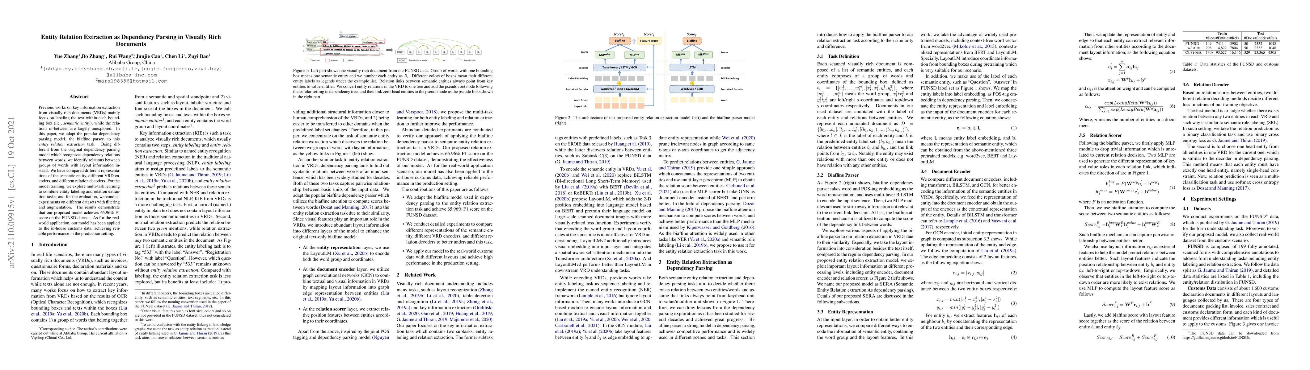 Previous works on key information extraction from visually rich documents (VRDs) mainly focus on labeling the text within each bounding box (i.e., semantic entity), while the relations in-between are largely unexplored. In this paper, we adapt the popular dependency parsing model, the biaffine parser, to this entity relation extraction task. Being different from the original dependency parsing model which recognizes dependency relations between words, we identify relations between groups of words with layout information instead. We have compared different representations of the semantic entity, different VRD encoders, and different relation decoders. The results demonstrate that our proposed model achieves 65.96% F1 score on the FUNSD dataset. As for the real-world application, our model has been applied to the in-house customs data, achieving reliable performance in the production setting.