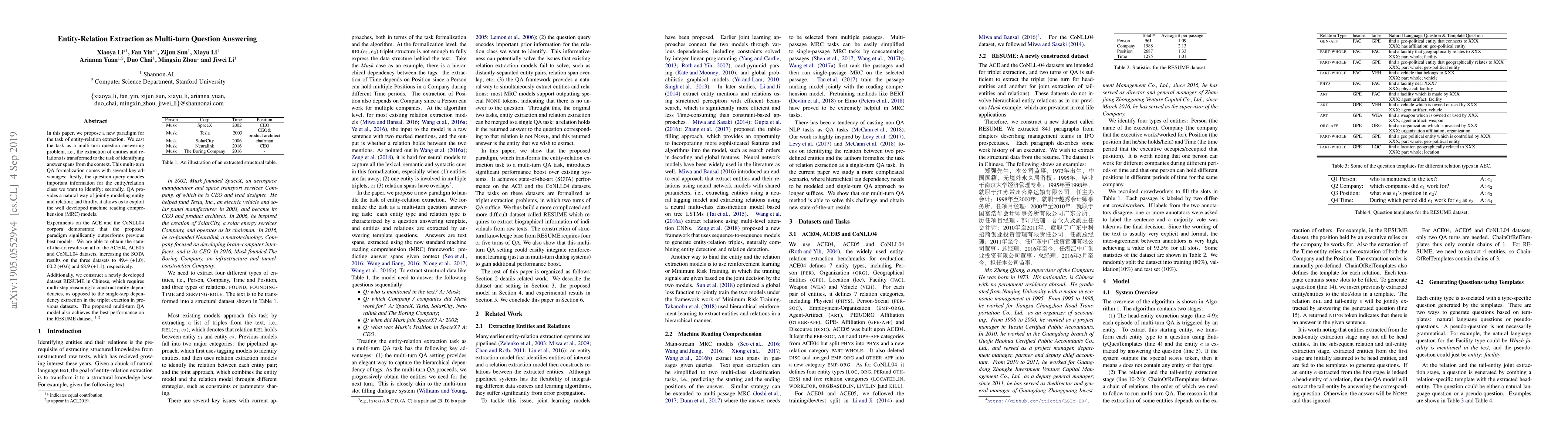 This paper proposes a new approach to entity-relation extraction by framing it as a multi-turn question answering problem, leveraging advanced machine reading comprehension models. The method outperforms previous state-of-the-art results on multiple datasets, including ACE and CoNLL04, and also achieves the best performance on a newly developed Chinese dataset requiring multi-step reasoning.