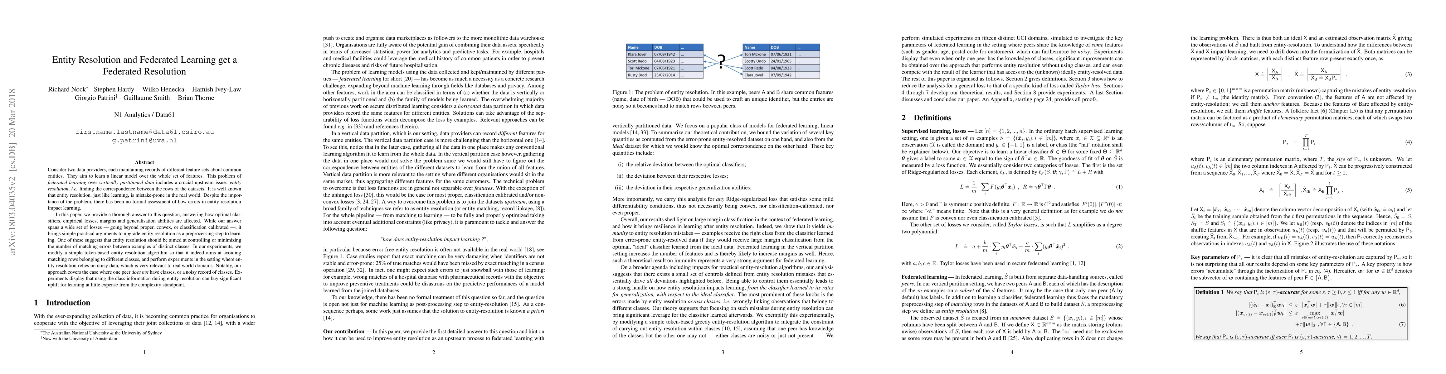 Consider two data providers, each maintaining records of different feature sets about common entities. They aim to learn a linear model over the whole set of features. This problem of federated learning over vertically partitioned data includes a crucial upstream issue: entity resolution, i.e. finding the correspondence between the rows of the datasets. It is well known that entity resolution, just like learning, is mistake-prone in the real world. Despite the importance of the problem, there has been no formal assessment of how errors in entity resolution impact learning. In this paper, we provide a thorough answer to this question, answering how optimal classifiers, empirical losses, margins and generalisation abilities are affected. While our answer spans a wide set of losses --- going beyond proper, convex, or classification calibrated ---, it brings simple practical arguments to upgrade entity resolution as a preprocessing step to learning. One of these suggests that entity resolution should be aimed at controlling or minimizing the number of matching errors between examples of distinct classes. In our experiments, we modify a simple token-based entity resolution algorithm so that it indeed aims at avoiding matching rows belonging to different classes, and perform experiments in the setting where entity resolution relies on noisy data, which is very relevant to real world domains. Notably, our approach covers the case where one peer \textit{does not} have classes, or a noisy record of classes. Experiments display that using the class information during entity resolution can buy significant uplift for learning at little expense from the complexity standpoint.