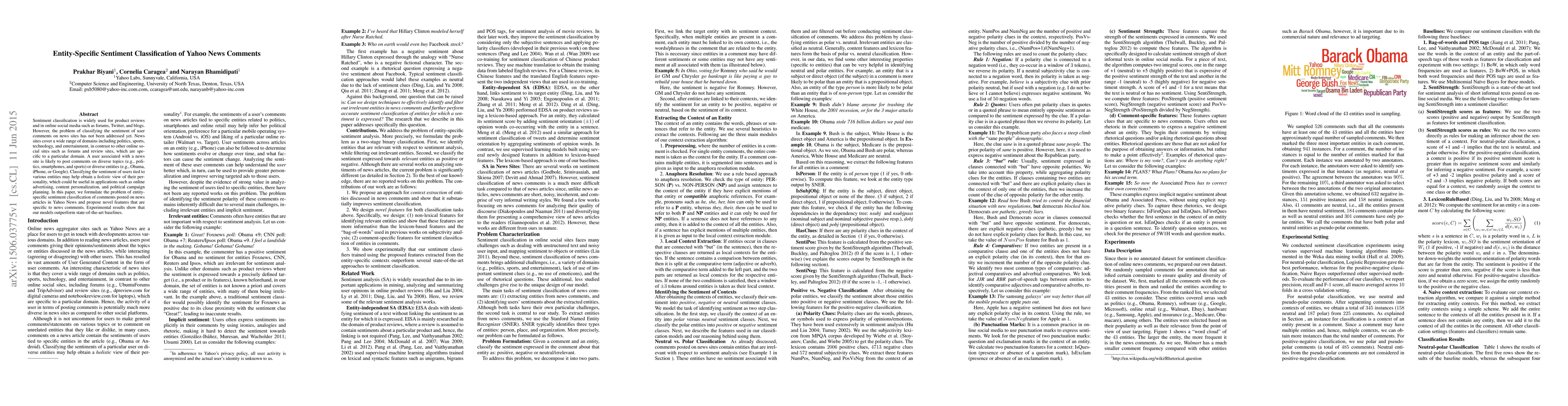 This paper addresses the novel problem of classifying sentiment in user comments on news sites, proposing specific features for entity-based sentiment analysis in Yahoo News comments. The study demonstrates that its models outperform existing baselines, highlighting potential applications in online advertising and political campaign planning.