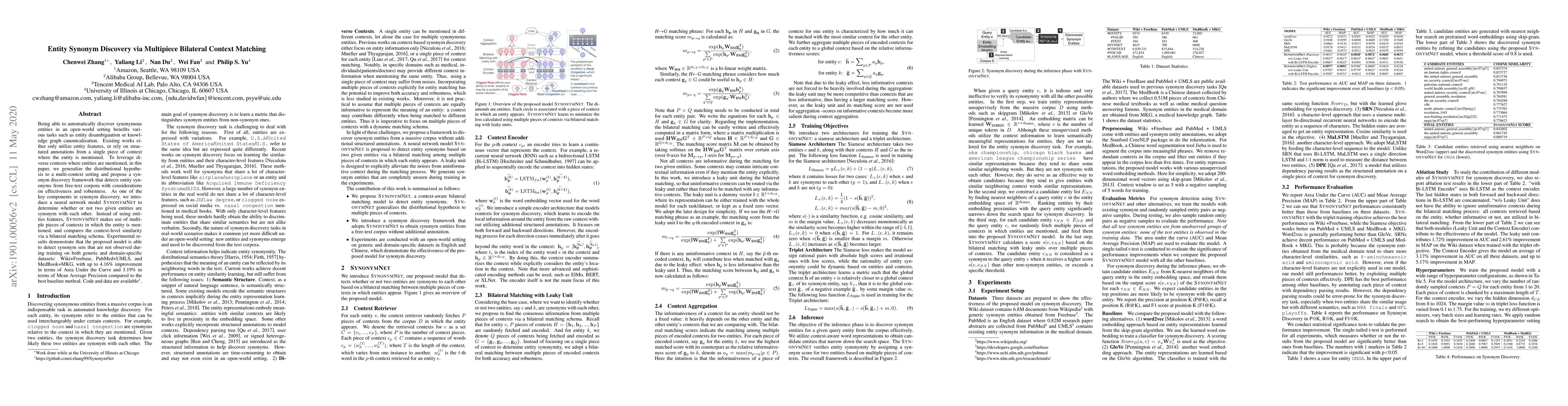 This paper proposes a framework for discovering entity synonyms in an open-world setting by leveraging multi-context information through a bilateral matching schema. The SYNONYMNET neural network model uses multiple context pieces to determine synonymy, achieving up to 4.16% improvement in AUC and 3.19% in MAP compared to baselines on various datasets.