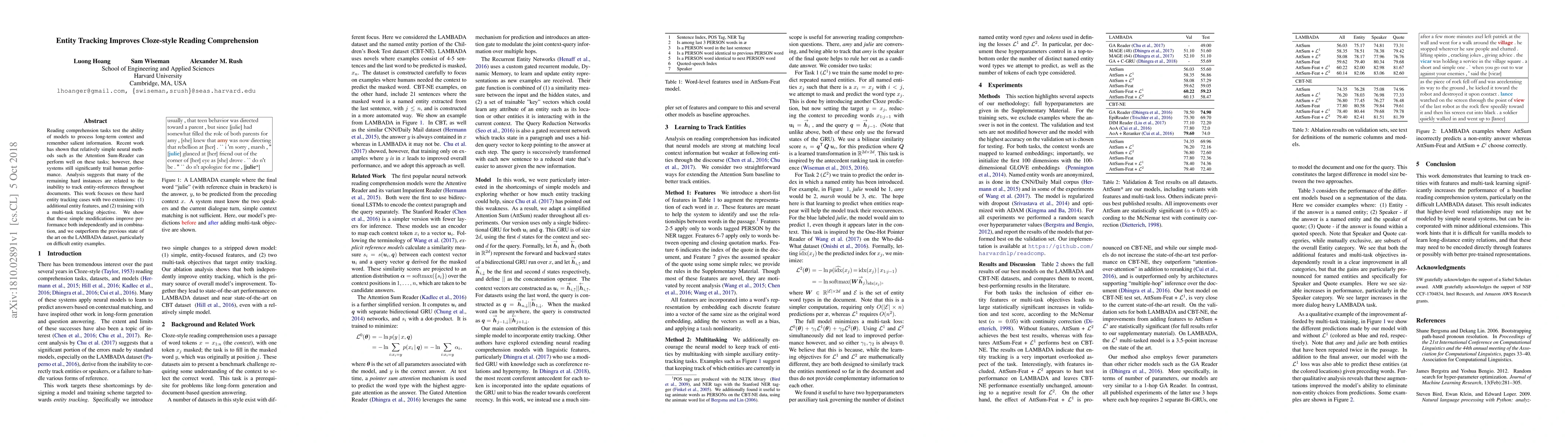 This paper investigates how improving entity tracking in neural models enhances cloze-style reading comprehension. By adding entity features and training with a multi-task tracking objective, the authors achieve better performance, surpassing previous methods on the LAMBADA dataset, especially for challenging entity examples.