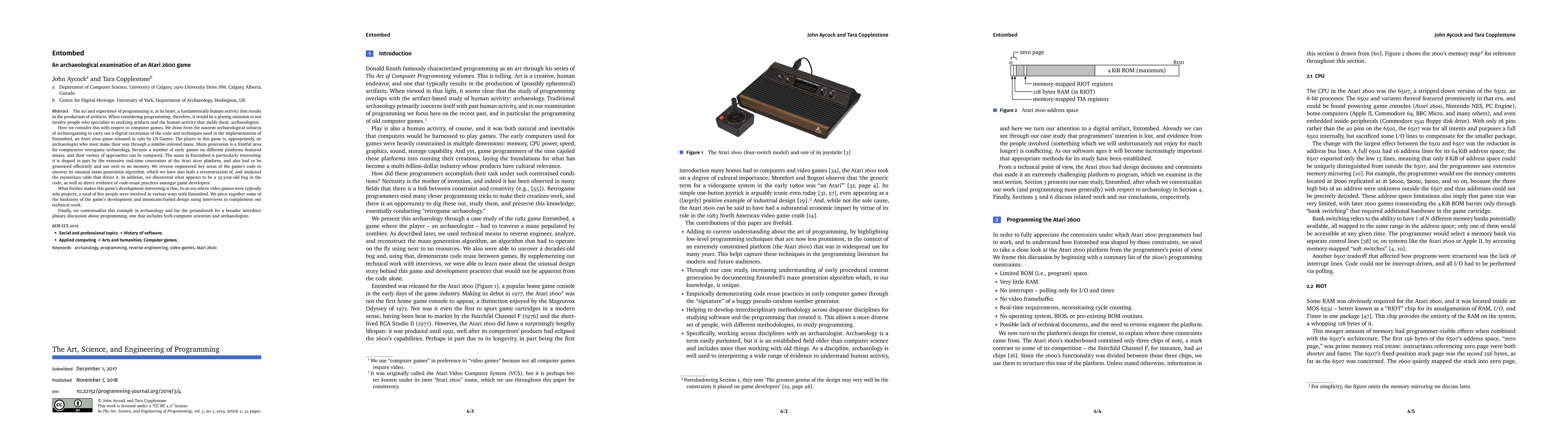This paper conducts an archaeological examination of the Atari 2600 game Entombed, focusing on its maze-generation algorithm and the development history involving five people. The study uncovers a 35-year-old bug and evidence of code reuse, contextualizing the technical and human aspects of early game programming.