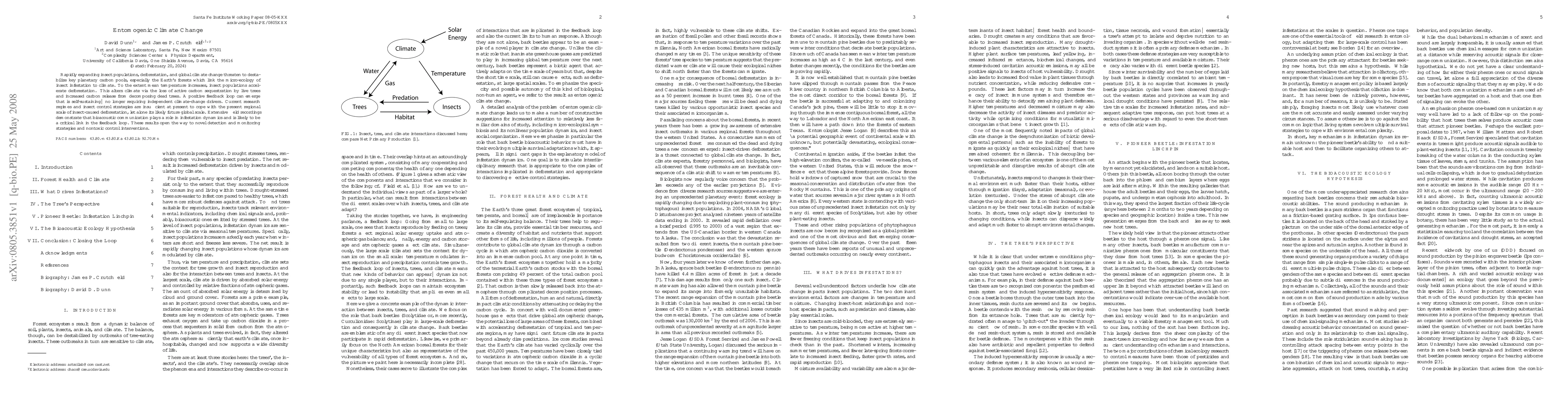 Rapidly expanding insect populations, deforestation, and global climate change threaten to destabilize key planetary carbon pools, especially the Earth's forests which link the micro-ecology of insect infestation to climate. To the extent mean temperature increases, insect populations accelerate deforestation. This alters climate via the loss of active carbon sequestration by live trees and increased carbon release from decomposing dead trees. A positive feedback loop can emerge that is self-sustaining--no longer requiring independent climate-change drivers. Current research regimes and insect control strategies are insufficient at present to cope with the present regional scale of insect-caused deforestation, let alone its likely future global scale. Extensive field recordings demonstrate that bioacoustic communication plays a role in infestation dynamics and is likely to be a critical link in the feedback loop. These results open the way to novel detection and monitoring strategies and nontoxic control interventions.