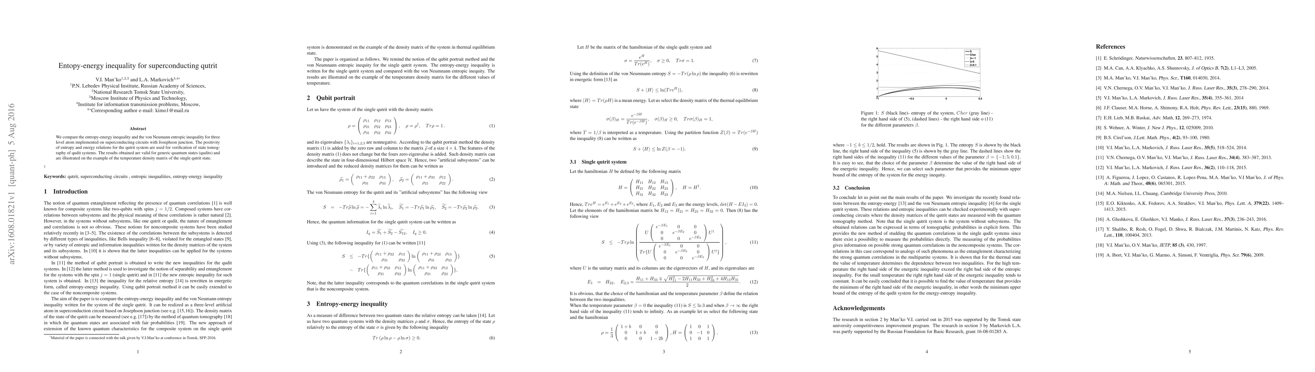 This paper examines the entropy-energy inequality in superconducting qutrit systems, comparing it with the von Neumann entropic inequality, and uses these relations to verify state tomography for qudit systems, demonstrating the results with a single qutrit's temperature density matrix.