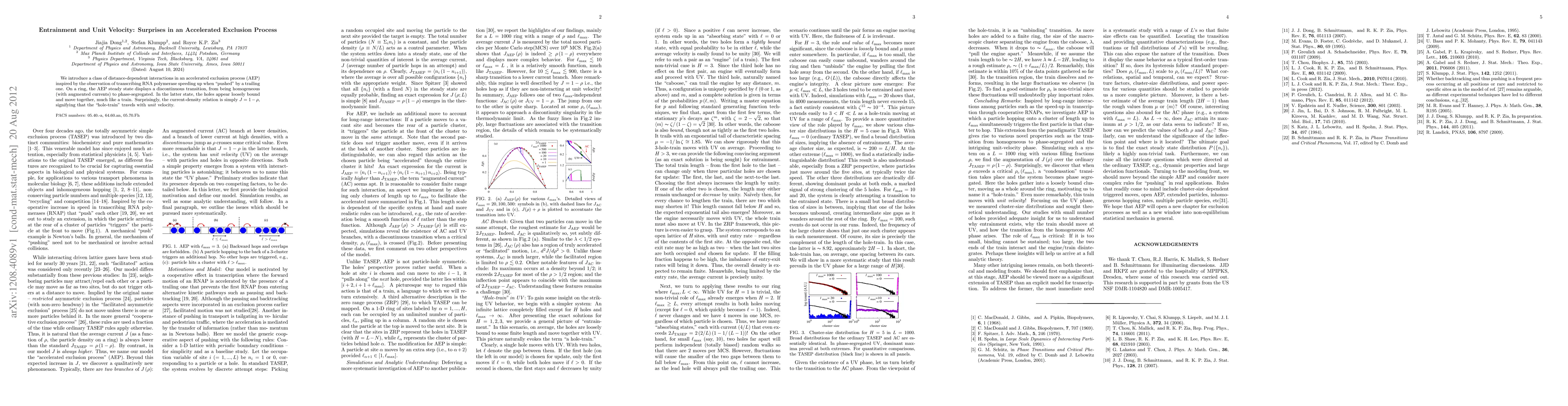 The research introduces a class of distance-dependent interactions in an accelerated exclusion process (AEP), inspired by RNA polymerase behavior. It explores steady-state properties on a ring, revealing a discontinuous transition from homogeneous to phase-segregated states.
