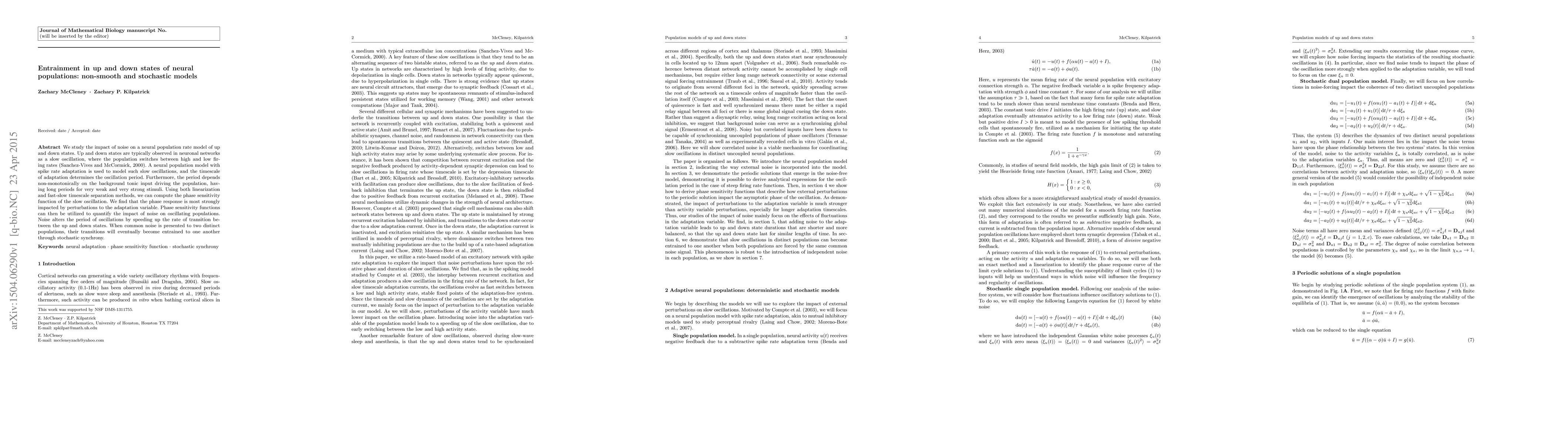 We study the impact of noise on a neural population rate model of up and down states. Up and down states are typically observed in neuronal networks as a slow oscillation, where the population switches between high and low firing rates (Sanchez-Vivez and McCormick, 2000). A neural population model with spike rate adaptation is used to model such slow oscillations, and the timescale of adaptation determines the oscillation period. Furthermore, the period depends non-monotonically on the background tonic input driving the population, having long periods for very weak and very strong stimuli. Using both linearization and fast-slow timescale separation methods, we can compute the phase sensitivity function of the slow oscillation. We find that the phase response is most strongly impacted by perturbations to the adaptation variable. Phase sensitivity functions can then be utilized to quantify the impact of noise on oscillating populations. Noise alters the period of oscillations by speeding up the rate of transition between the up and down states. When common noise is presented to two distinct populations, their transitions will eventually become entrained to one another through stochastic synchrony.