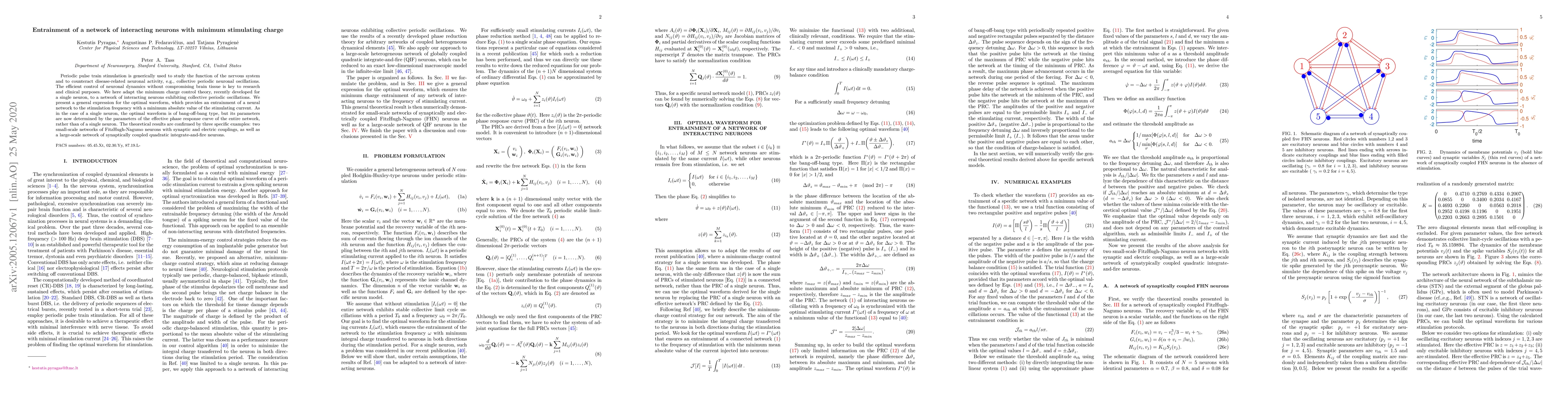 Periodic pulse train stimulation is generically used to study the function of the nervous system and to counteract disease-related neuronal activity, e.g., collective periodic neuronal oscillations. The efficient control of neuronal dynamics without compromising brain tissue is key to research and clinical purposes. We here adapt the minimum charge control theory, recently developed for a single neuron, to a network of interacting neurons exhibiting collective periodic oscillations. We present a general expression for the optimal waveform, which provides an entrainment of a neural network to the stimulation frequency with a minimum absolute value of the stimulating current. As in the case of a single neuron, the optimal waveform is of bang-off-bang type, but its parameters are now determined by the parameters of the effective phase response curve of the entire network, rather than of a single neuron. The theoretical results are confirmed by three specific examples: two small-scale networks of FitzHugh-Nagumo neurons with synaptic and electric couplings, as well as a large-scale network of synaptically coupled quadratic integrate-and-fire neurons.