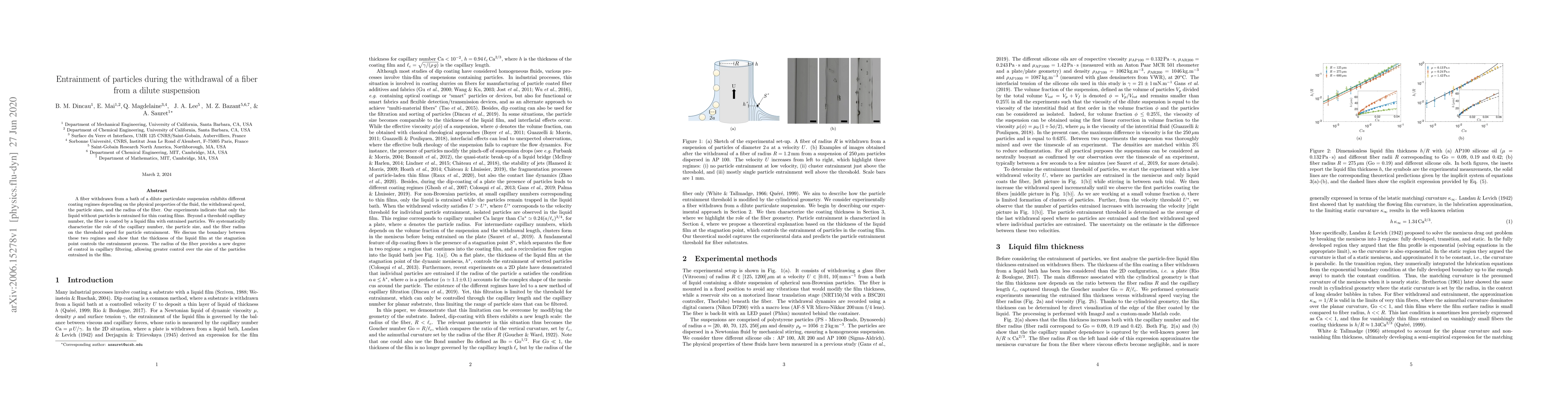This study investigates the entrainment of particles during fiber withdrawal from a dilute suspension, identifying different coating regimes based on fluid properties and withdrawal speed. The research finds that particle entrainment occurs above a threshold capillary number, with fiber radius influencing the size of entrained particles.