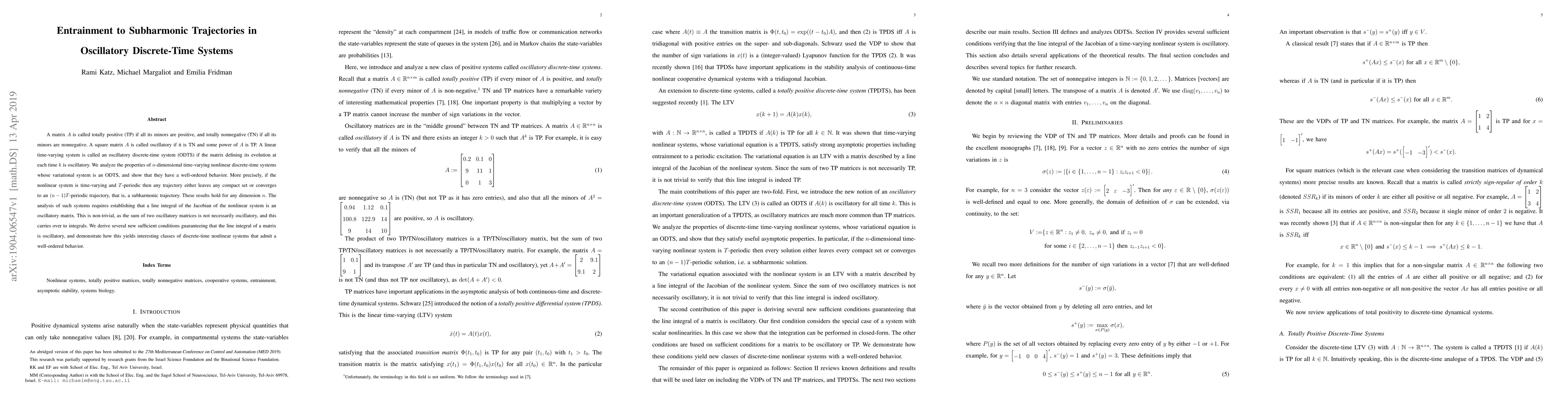 A matrix $A$ is called totally positive (TP) if all its minors are positive, and totally nonnegative (TN) if all its minors are nonnegative. A square matrix $A$ is called oscillatory if it is TN and some power of $A$ is TP. A linear time-varying system is called an oscillatory discrete-time system (ODTS) if the matrix defining its evolution at each time $k$ is oscillatory. We analyze the properties of $n$-dimensional time-varying nonlinear discrete-time systems whose variational system is an ODTS, and show that they have a well-ordered behavior. More precisely, if the nonlinear system is time-varying and $T$-periodic then any trajectory either leaves any compact set or converges to an $(n-1)T$-periodic trajectory, that is, a subharmonic trajectory. These results hold for any dimension $n$. The analysis of such systems requires establishing that a line integral of the Jacobian of the nonlinear system is an oscillatory matrix. This is non-trivial, as the sum of two oscillatory matrices is not necessarily oscillatory, and this carries over to integrals. We derive several new sufficient conditions guaranteeing that the line integral of a matrix is oscillatory, and demonstrate how this yields interesting classes of discrete-time nonlinear systems that admit a well-ordered behavior.