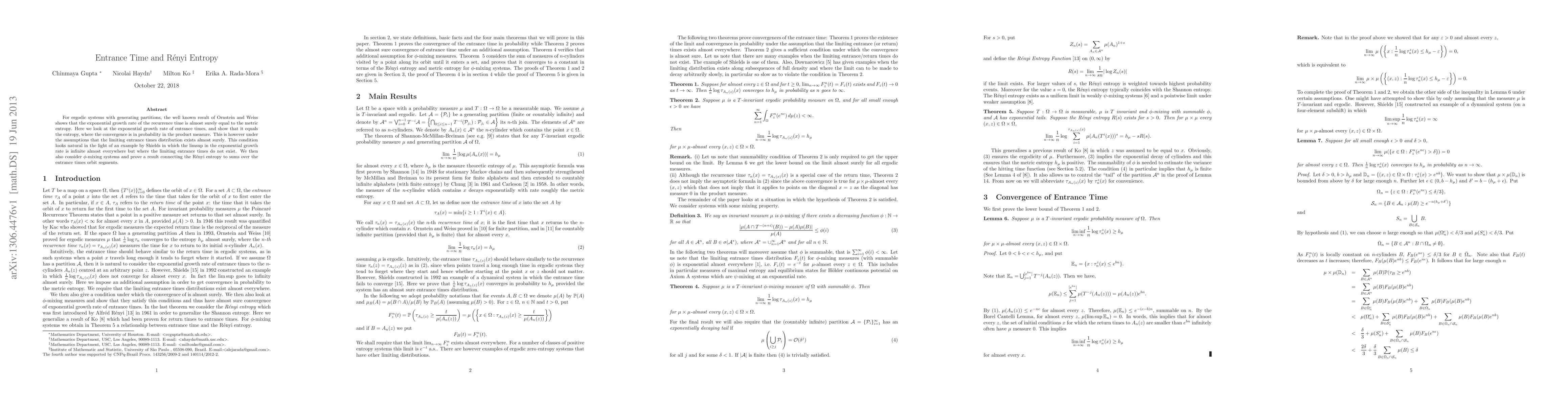 For ergodic systems with generating partitions, the well known result of Ornstein and Weiss shows that the exponential growth rate of the recurrence time is almost surely equal to the metric entropy. Here we look at the exponential growth rate of entrance times, and show that it equals the entropy, where the convergence is in probability in the product measure. This is however under the assumptions that the limiting entrance times distribution exists almost surely. This condition looks natural in the light of an example by Shields in which the limsup in the exponential growth rate is infinite almost everywhere but where the limiting entrance times do not exist. We then also consider $\phi$-mixing systems and prove a result connecting the R\'enyi entropy to sums over the entrance times orbit segments.