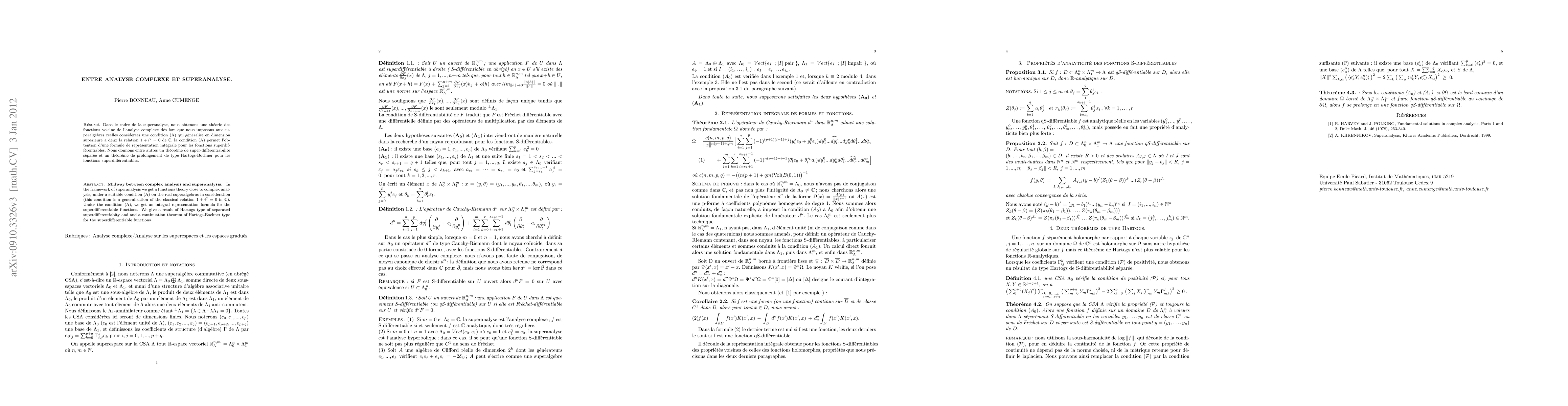 In the framework of superanalysis we get a functions theory close to complex analysis, under a suitable condition (A) on the real superalgebras in consideration. Under the condition (A), we get an integral representation formula for the superdifferentiable functions.We give a result of Hartogs type of separated superdifferentiability and a continuation theorem of Hartogs-Bochner type for the superdifferentiable functions.