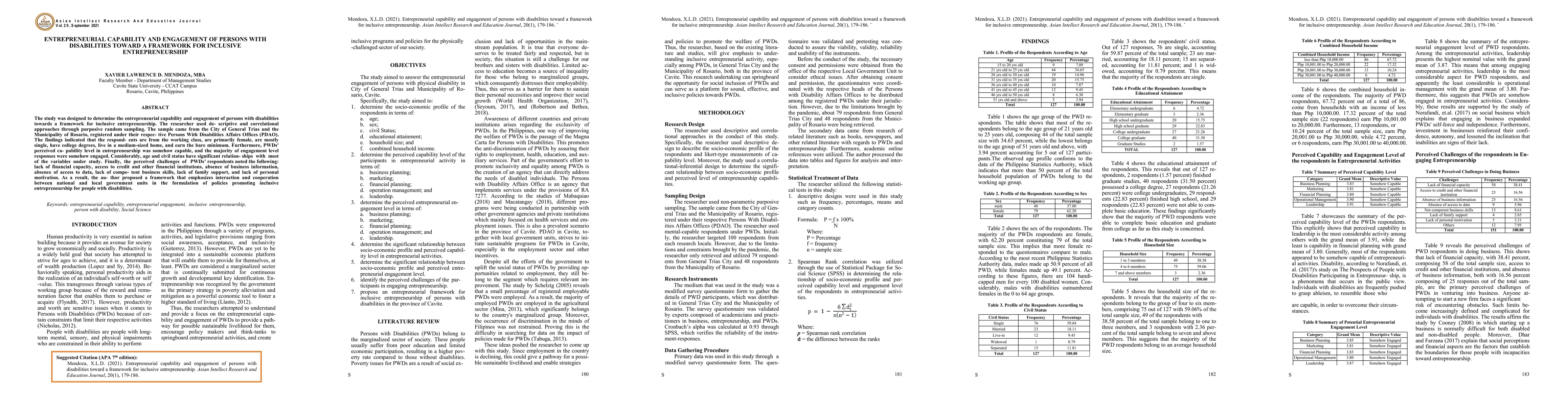 The study was designed to determine the entrepreneurial capability and engagement of persons with disabilities toward a framework for inclusive entrepreneurship. The researcher used descriptive and correlational approaches through purposive random sampling. The sample came from the City of General Trias and the Municipality of Rosario, registered under their respective Persons with Disabilities Affairs Offices (PDAO). The findings indicated that the respondents are from the working class, are primarily female, are mostly single, have college degrees, live in a medium-sized home, and earn the bare minimum. Furthermore, PWDs' perceived capability level in entrepreneurship was somehow capable, and the majority of engagement level responses were somehow engaged. Considerably, age and civil status have significant relationships with most of the variables under study. Finally, the perceived challenges of PWDs' respondents noted the following: lack of financial capacity, access to credit and other financial institutions, absence of business information, absence of access to data, lack of competent business skills, lack of family support, and lack of personal motivation. As a result, the author proposed a framework that emphasizes interaction and cooperation between national and local government units in the formulation of policies promoting inclusive entrepreneurship for people with disabilities.