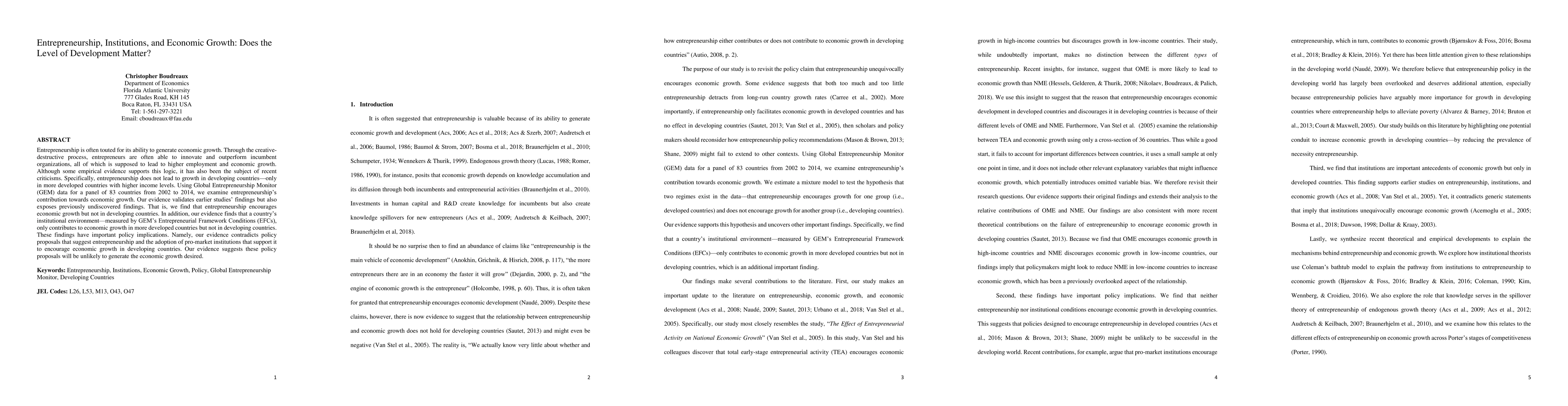 This paper investigates the relationship between entrepreneurship and economic growth across different levels of development, finding that entrepreneurship fosters growth in developed countries but not in developing ones. It also reveals that supportive institutional environments contribute to growth in developed countries but not in developing countries, challenging policies promoting entrepreneurship and pro-market institutions in the latter.