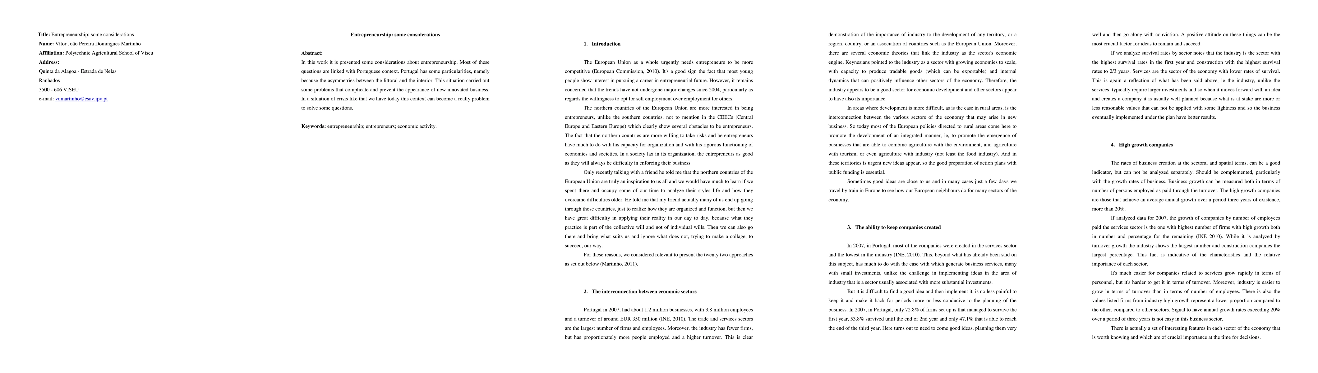 In this work it is presented some considerations about entrepreneurship. Most of these questions are linked with Portuguese context. Portugal has some particularities, namely because the asymmetries between the littoral and the interior. This situation carried out some problems that complicate and prevent the appearance of new innovated business. In a situation of crisis like that we have today this context can become a really problem to solve some questions.