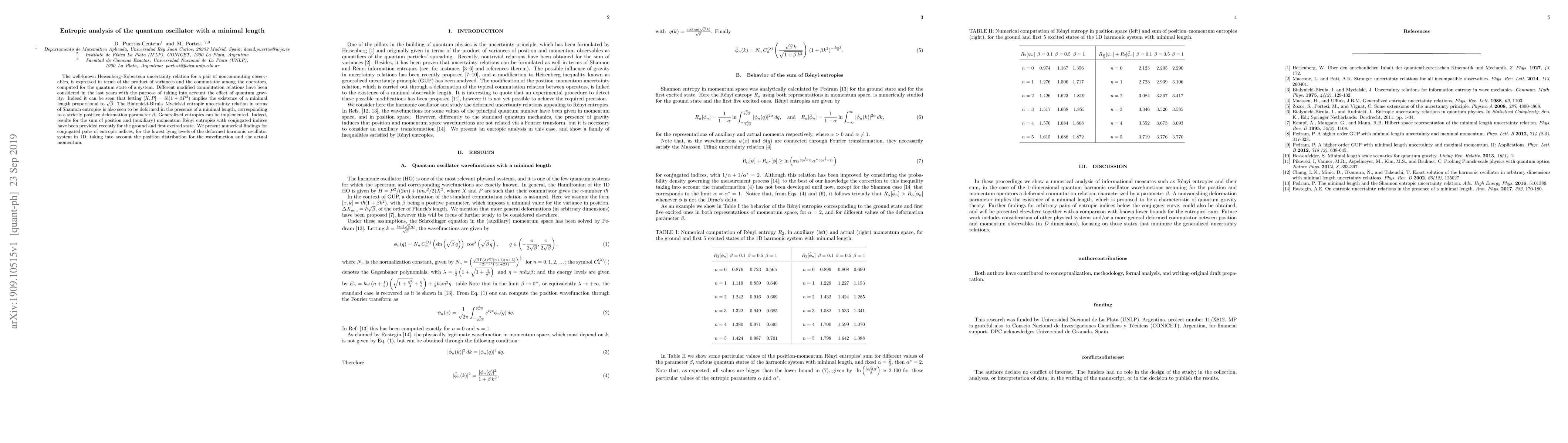 The paper presents a detailed entropic analysis of a quantum oscillator with a minimal length, including wavefunctions, energy levels, and numerical results for Rényi entropies in both position and momentum spaces.