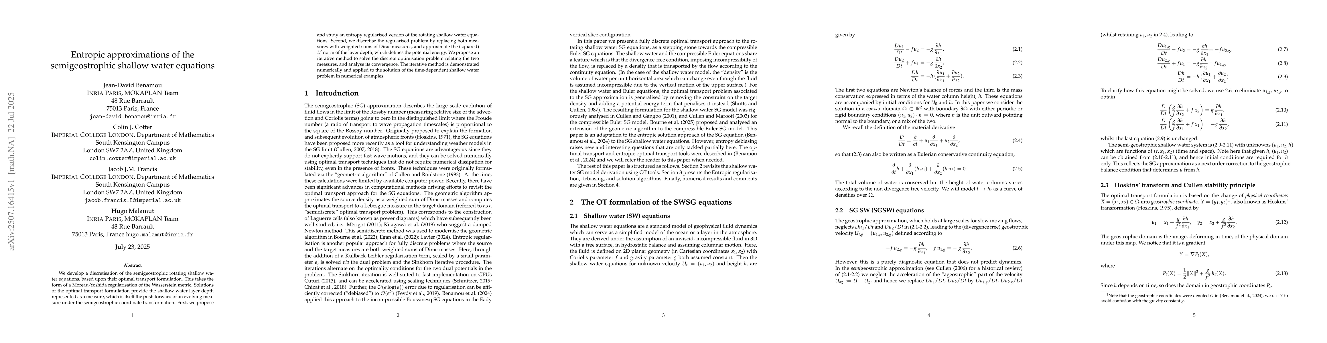 We develop a discretisation of the semigeostrophic rotating shallow water equations, based upon their optimal transport formulation. This takes the form of a Moreau-Yoshida regularisation of the Wasserstein metric. Solutions of the optimal transport formulation provide the shallow water layer depth represented as a measure, which is itself the push forward of an evolving measure under the semigeostrophic coordinate transformation. First, we propose and study an entropy regularised version of the rotating shallow water equations. Second, we discretise the regularised problem by replacing both measures with weighted sums of Dirac measures, and approximate the (squared) L2 norm of the layer depth, which defines the potential energy. We propose an iterative method to solve the discrete optimisation problem relating the two measures, and analyse its convergence. The iterative method is demonstrated numerically and applied to the solution of the time-dependent shallow water problem in numerical examples.