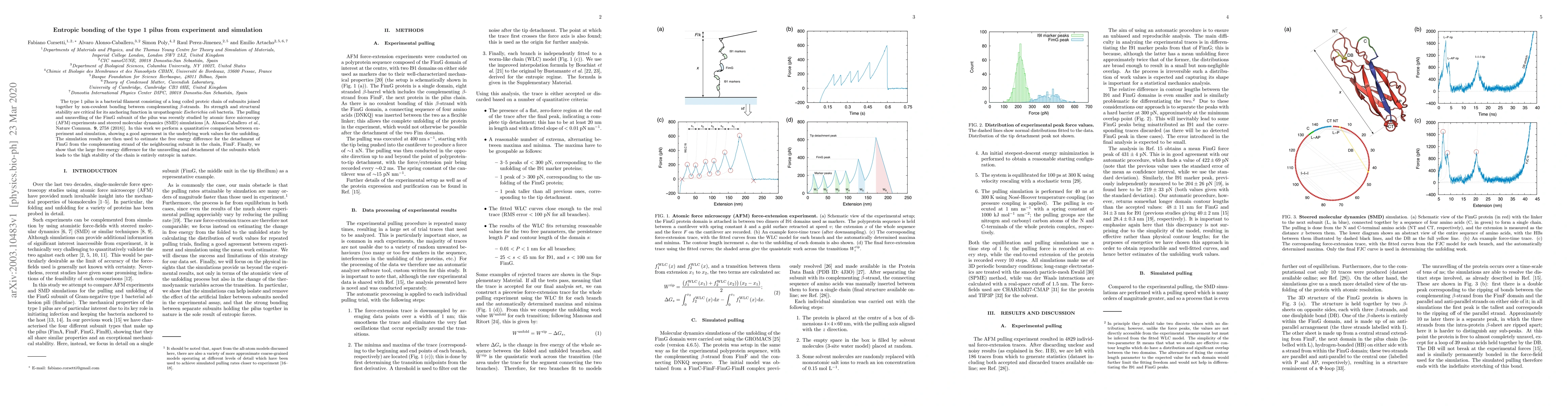The type 1 pilus is a bacterial filament consisting of a long coiled proteic chain of subunits joined together by non-covalent bonding between complementing $\beta$-strands. Its strength and structural stability are critical for its anchoring function in uropathogenic Escherichia coli bacteria. The pulling and unravelling of the FimG subunit of the pilus was recently studied by atomic force microscopy (AFM) experiments and steered molecular dynamics (SMD) simulations [A. Alonso-Caballero et al., Nature Commun. 9, 2758 (2018)]. In this work we perform a quantitative comparison between experiment and simulation, showing a good agreement in the underlying work values for the unfolding. The simulation results are then used to estimate the free energy difference for the detachment of FimG from the complementing strand of the neighbouring subunit in the chain, FimF. Finally, we show that the large free energy difference for the unravelling and detachment of the subunits which leads to the high stability of the chain is entirely entropic in nature.