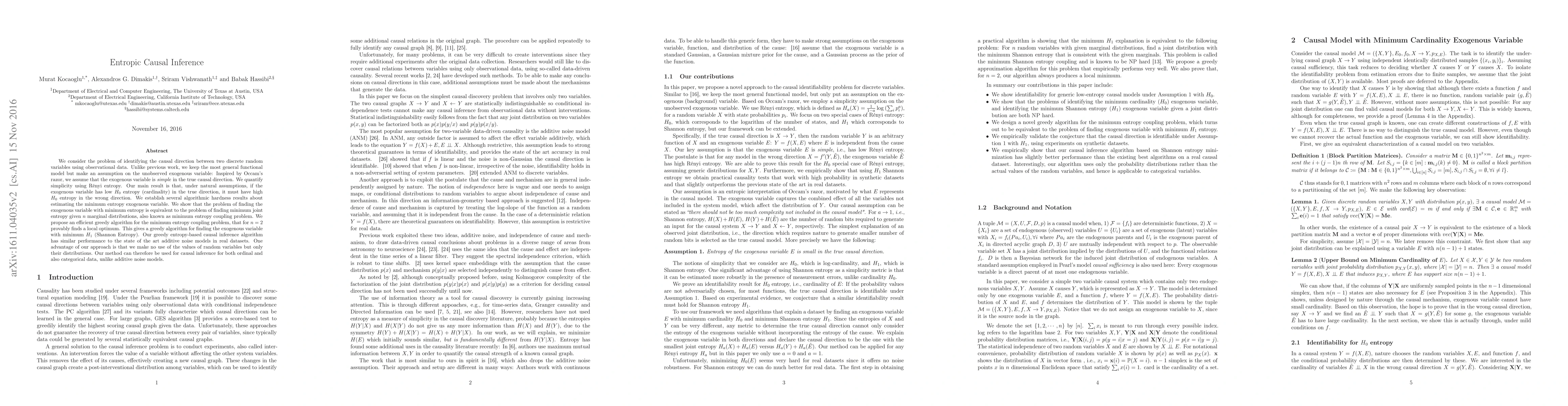 This paper proposes an entropy-based method for identifying causal direction between two discrete random variables using observational data. It assumes simplicity of the exogenous variable in the true causal direction, quantified by Rényi entropy, and establishes that low entropy in the true direction implies high entropy in the wrong direction. The method includes a greedy algorithm for finding the minimum entropy coupling, applicable to both ordinal and categorical data.