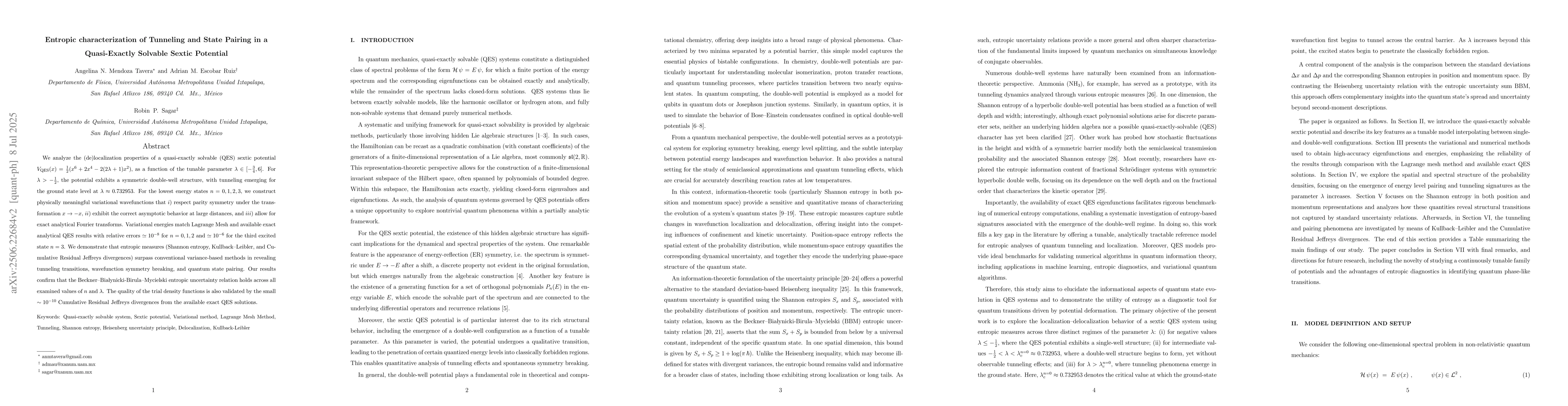 We analyze the (de)localization properties of a quasi-exactly solvable (QES) sextic potential $V_{\text{QES}}(x) = \frac{1}{2}(x^6 + 2x^4 - 2(2\lambda + 1)x^2)$ as a function of the tunable parameter $\lambda \in [-\frac{3}{4}, 6]$. For $\lambda > -\frac{1}{2}$, the potential exhibits a symmetric double-well structure, with tunneling emerging for the ground state level at $\lambda \approx 0.732953$. {For the lowest energy states \( n = 0,1,2,3 \), we construct physically meaningful variational wavefunctions that $i)$ respect parity symmetry under the transformation $ x \rightarrow -x $, $ii)$ exhibit the correct asymptotic behavior at large distances, and $iii)$ allow for exact analytical Fourier transforms. Variational energies match Lagrange Mesh and available exact analytical QES results with relative errors $\simeq 10^{-8}$ for $n = 0, 1, 2$ and $\simeq 10^{-6}$ for the third excited state $n=3$. We demonstrate that entropic measures (Shannon entropy, Kullback-Leibler, and Cumulative Residual Jeffreys divergences) surpass conventional variance-based methods in revealing tunneling transitions, wavefunction symmetry breaking, and quantum state pairing. Our results confirm that the Beckner-Bialynicki-Birula-Mycielski entropic uncertainty relation holds across all examined values of $n$ and $\lambda$. The quality of the trial function is also validated by the small $\sim10^{-10}$ Cumulative Residual Jeffreys divergences from the exact QES solutions.