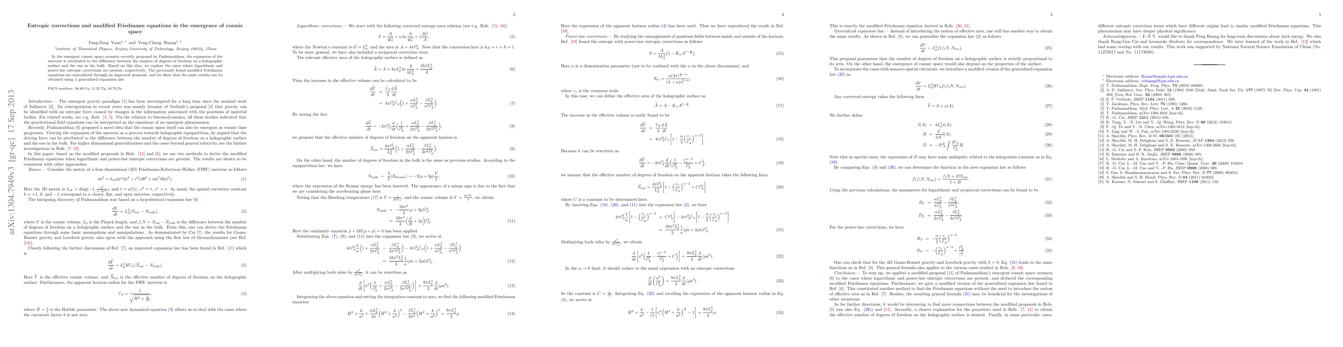 This paper investigates entropic corrections in the emergent cosmic space model proposed by Padmanabhan, proposing modified Friedmann equations through logarithmic and power-law corrections. It demonstrates that these corrections lead to the same expansion dynamics as previously found using a generalized expansion law.
