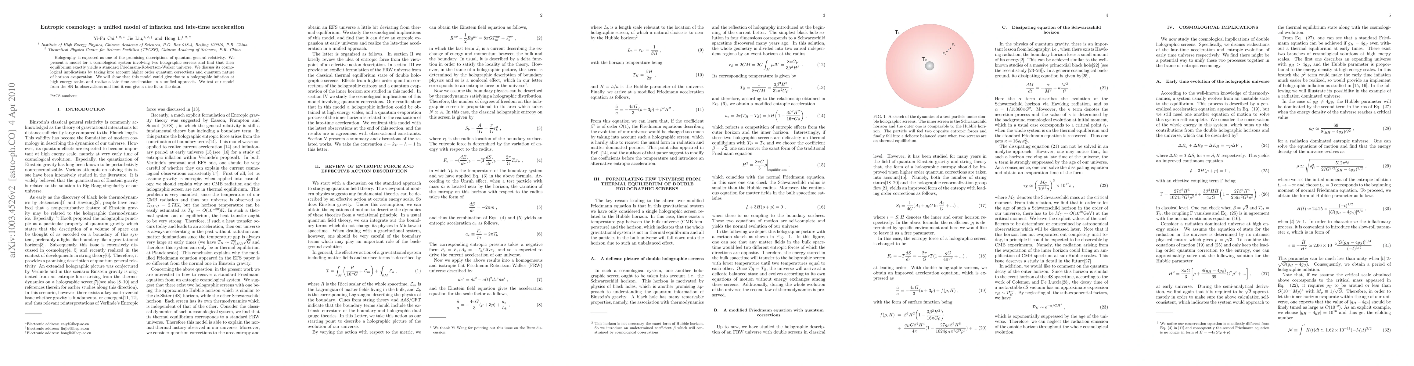 This paper proposes a unified entropic cosmology model using holography to describe both inflation and late-time cosmic acceleration. The model employs two holographic screens to achieve a standard Friedmann-Robertson-Walker universe, incorporating higher-order quantum corrections and horizon evaporation, and fits well with Type Ia supernova observations.