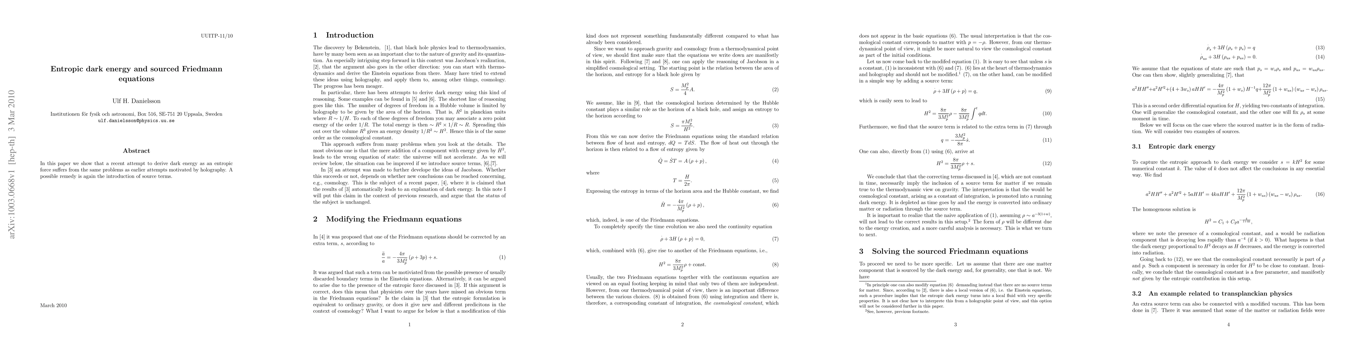 In this paper we show that a recent attempt to derive dark energy as an entropic force suffers from the same problems as earlier attempts motivated by holography. The possible remedy is again the introduction of source terms.
