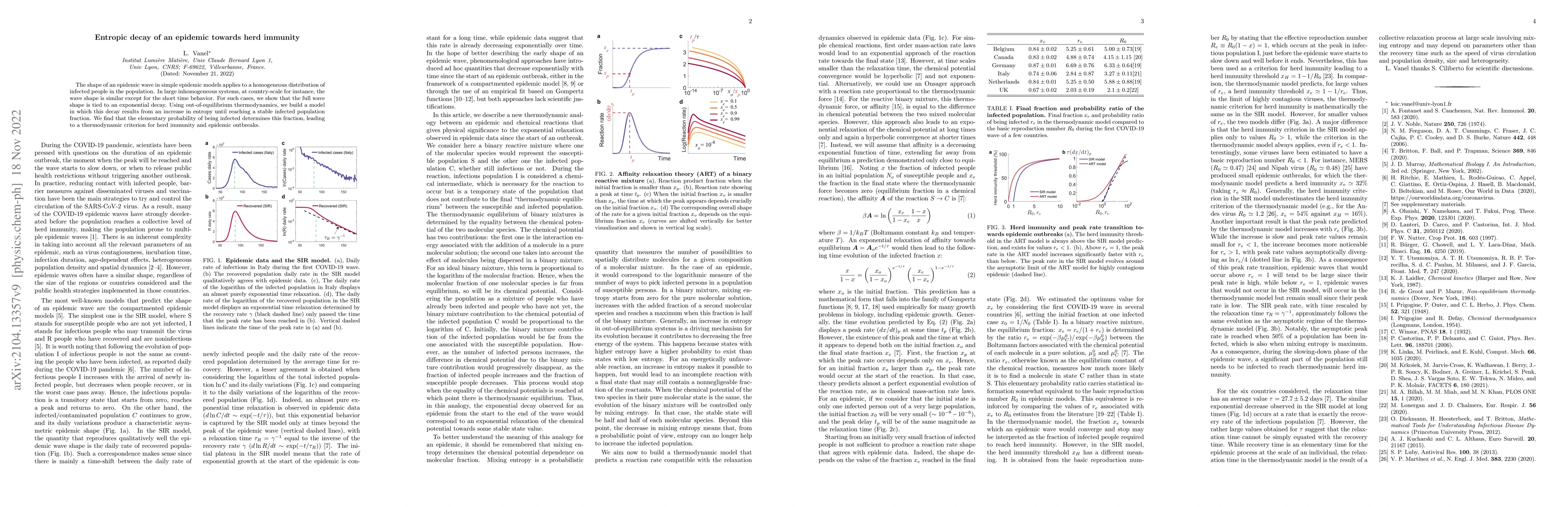 This paper develops a thermodynamic model to describe the entropic decay of epidemic waves in large, inhomogeneous populations, showing that the wave shape follows an exponential decay linked to entropy increase. It identifies a thermodynamic criterion for herd immunity based on the elementary probability of infection.