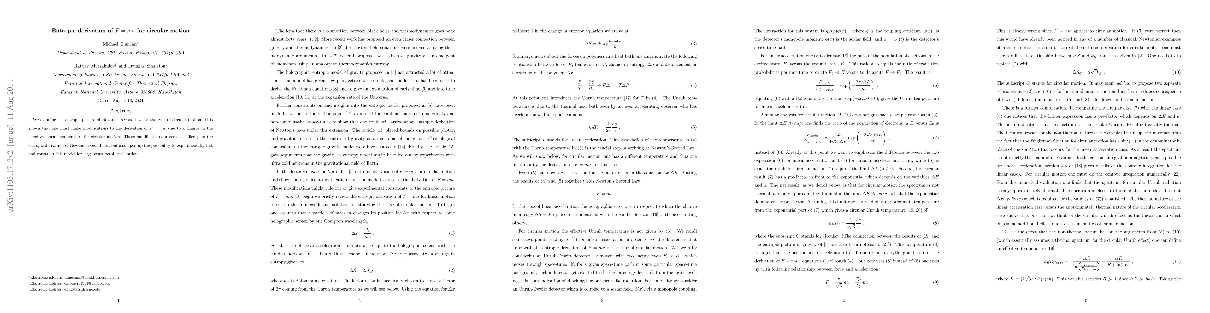 We examine the entropic picture of Newton's second law for the case of circular motion. It is shown that one must make modifications to the derivation of F=ma due to a change in the effective Unruh temperature for circular motion. These modifications present a challenge to the entropic derivation of Newton's second law, but also open up the possibility to experimentally test and constrain this model for large centripetal accelerations.