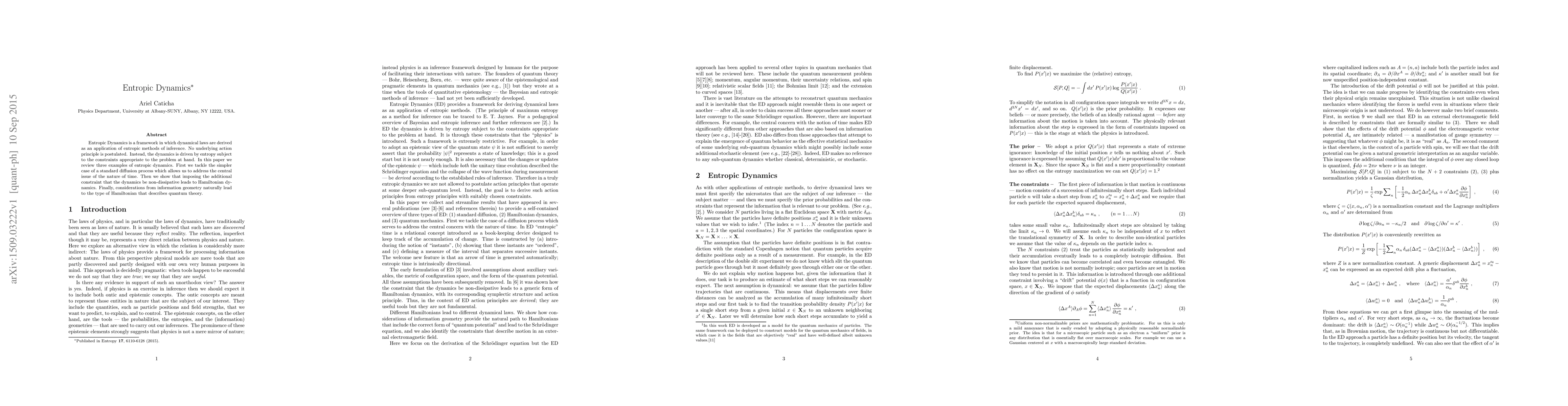 Entropic Dynamics derives dynamical laws through entropic inference, driven by entropy under specific constraints. The paper reviews three examples: standard diffusion, non-dissipative Hamiltonian dynamics, and information geometry leading to quantum Hamiltonians.