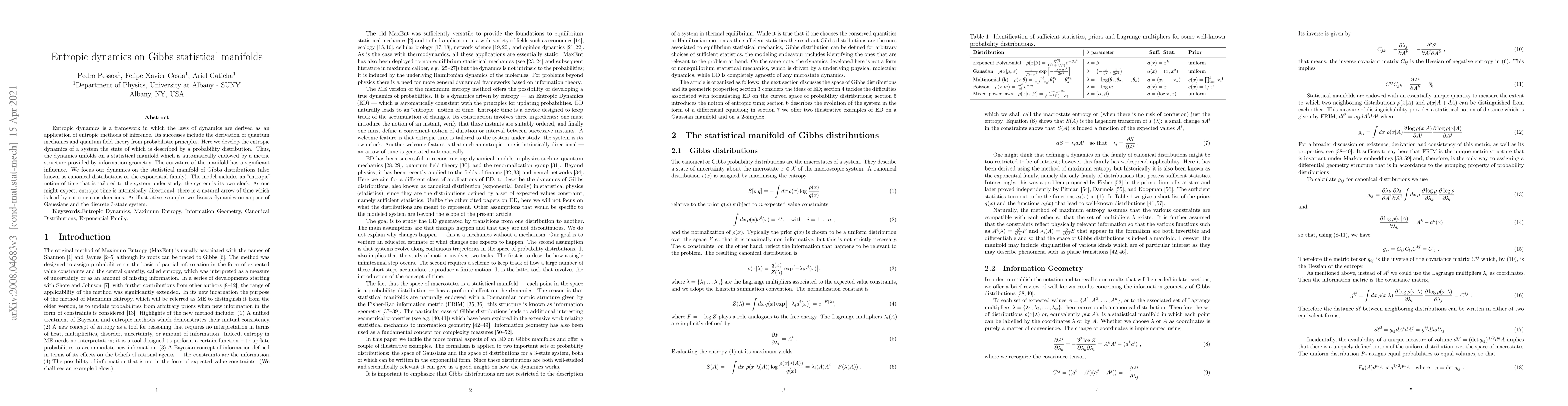 This paper develops entropic dynamics on the statistical manifold of Gibbs distributions, deriving laws of motion from probabilistic principles. The dynamics are influenced by the manifold's curvature, and an intrinsic entropic notion of time is introduced, providing a natural arrow of time.