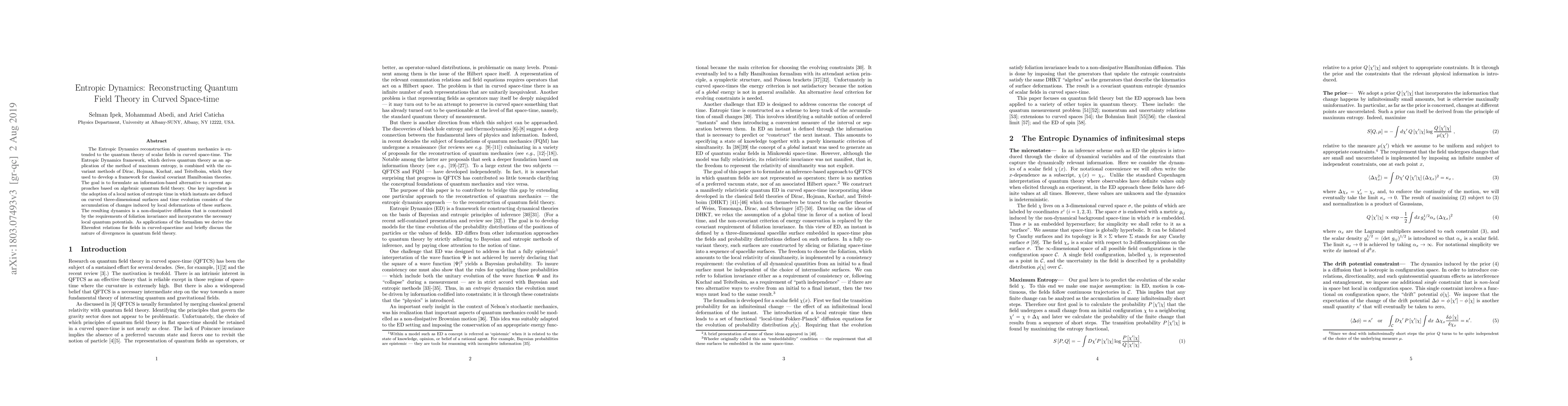 This paper extends Entropic Dynamics to quantum field theory in curved space-time, combining maximum entropy principles with covariant classical Hamiltonian methods. It proposes a local entropic time approach to derive a non-dissipative diffusion dynamics, aiming to provide an information-based alternative to algebraic quantum field theory.