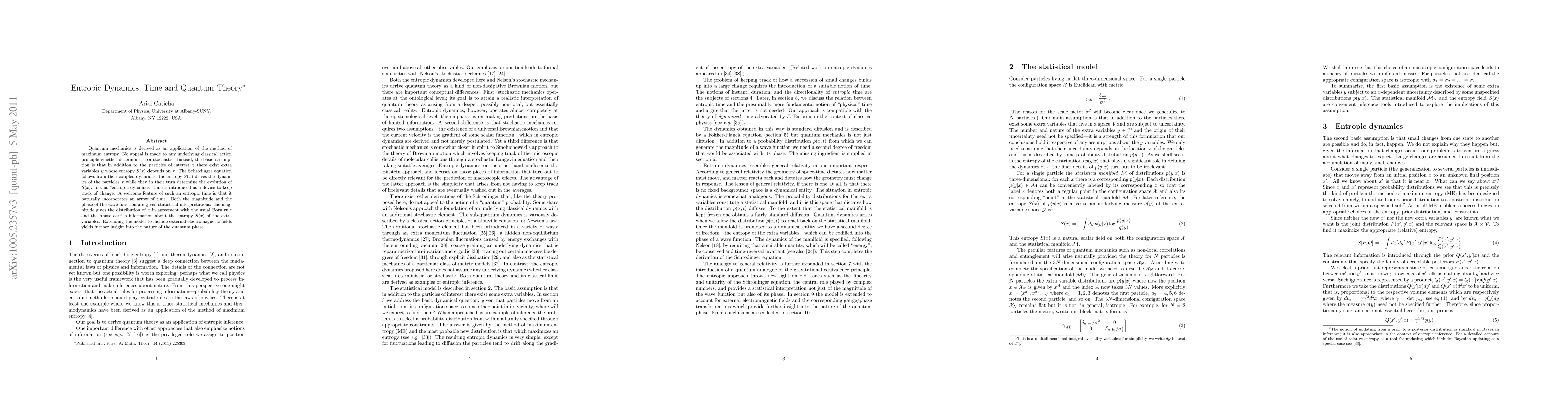 Quantum mechanics is derived as an application of the method of maximum entropy. No appeal is made to any underlying classical action principle whether deterministic or stochastic. Instead, the basic assumption is that in addition to the particles of interest x there exist extra variables y whose entropy S(x) depends on x. The Schr\"odinger equation follows from their coupled dynamics: the entropy S(x) drives the dynamics of the particles x while they in their turn determine the evolution of S(x). In this "entropic dynamics" time is introduced as a device to keep track of change. A welcome feature of such an entropic time is that it naturally incorporates an arrow of time. Both the magnitude and the phase of the wave function are given statistical interpretations: the magnitude gives the distribution of x in agreement with the usual Born rule and the phase carries information about the entropy S(x) of the extra variables. Extending the model to include external electromagnetic fields yields further insight into the nature of the quantum phase.