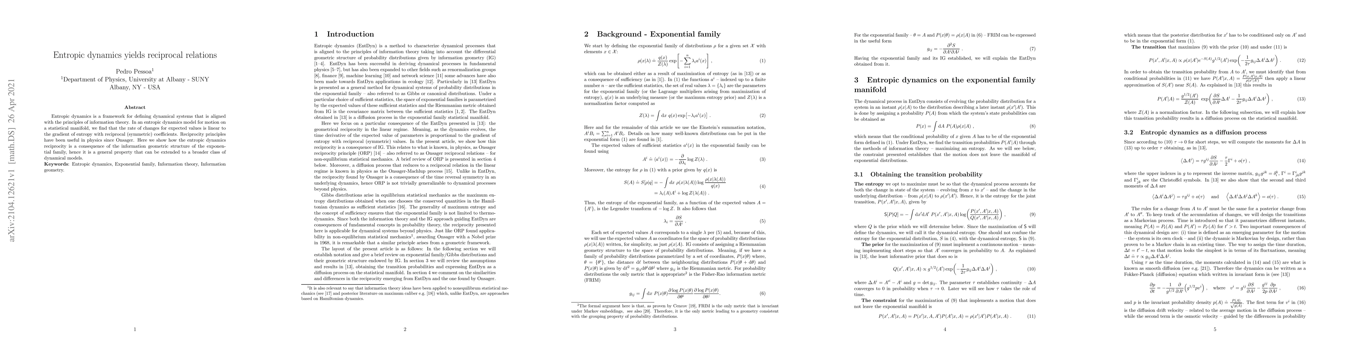 Entropic dynamics establishes a framework for dynamical systems based on information theory, revealing that changes in expected values are linearly related to entropy gradients with reciprocal coefficients. This reciprocity is a general property stemming from the information geometric structure of the exponential family.