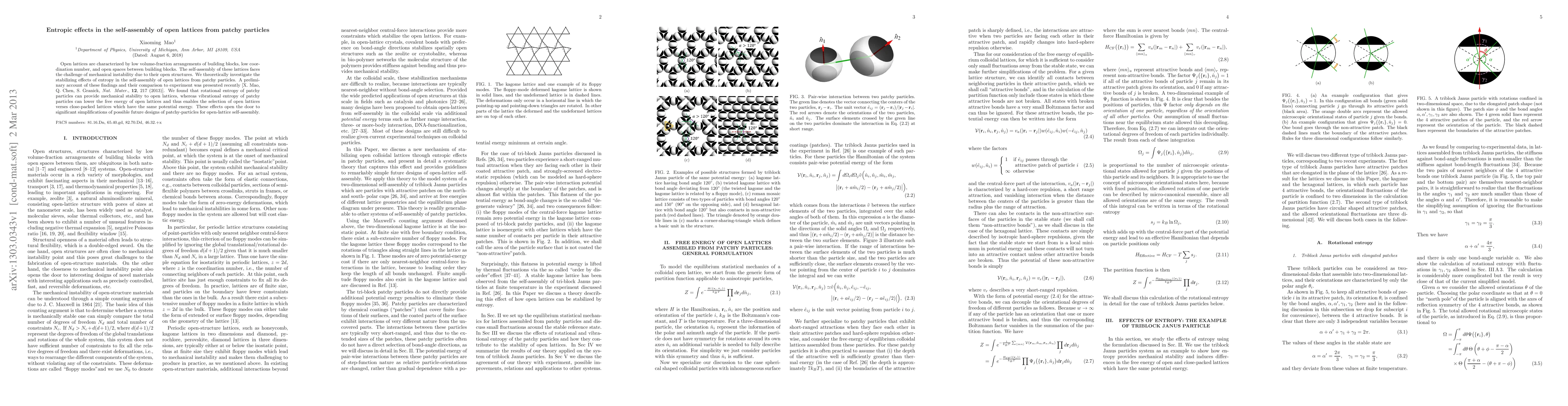 This paper explores how entropy influences the self-assembly of mechanically unstable open lattices from patchy particles. It finds that rotational entropy stabilizes the lattices while vibrational entropy lowers their free energy, favoring open lattices over close-packed ones.